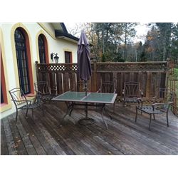 Patio Furniture Set with Table, 6 Chairs, Umbrella including chair pads.