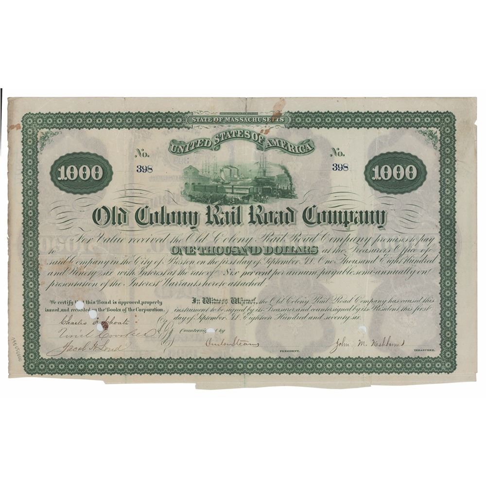 Partly-printed DS, one page, 13.5 x 8.5, September 1, 1876. Bond for $1000 issued by the Old Colony Rail Road Company, signed in ink by Onslow Stearns as president and countersigned by Uriel Crocker as a member of the finance committee. The certificate features a vivid green border and fine vignette of a railroad scene. In fine condition, with a roughly clipped bottom edge and some marginal staining. Onslow Stearns (1810-1878) was a businessman and politician who served as governor of New Hampshire from 1869 to 1871. Uriel Crocker (1796-1887) was a noted Boston-based publisher, railway organizer, and philanthropist.