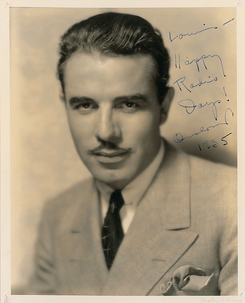 Vintage glossy 8 x 10 Universal Pictures doubleweight photo of Stevens looking dapper, signed and inscribed in fountain pen “Louis—Happy Radio Days! Onslow, 1935.” In very good condition, with tack holes to each corner, a light notation in the lower border, and some slightly irregular adhesion to the signature.