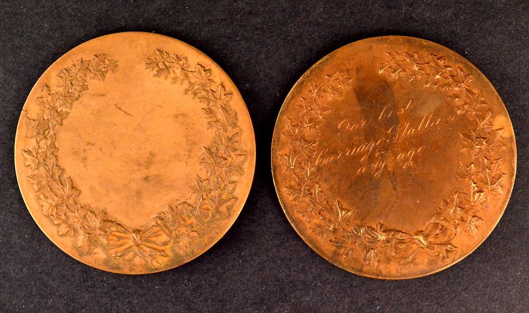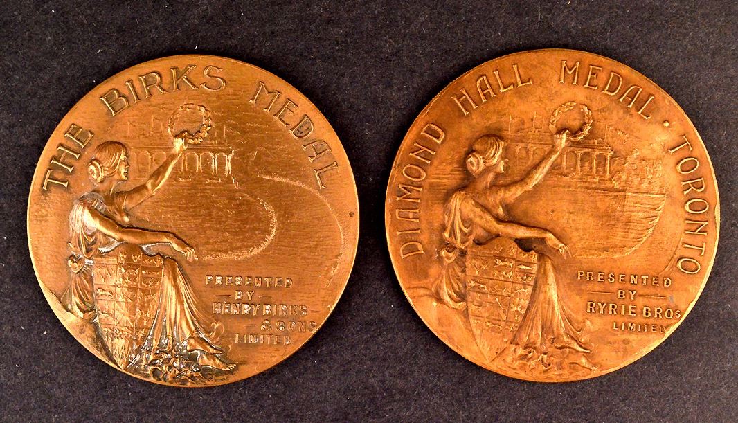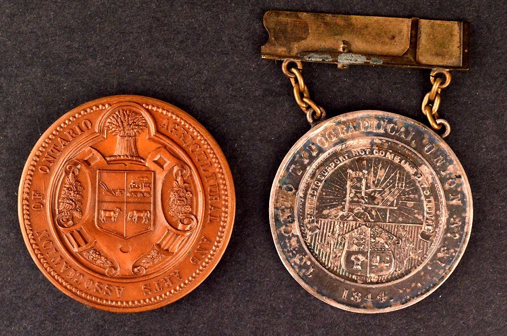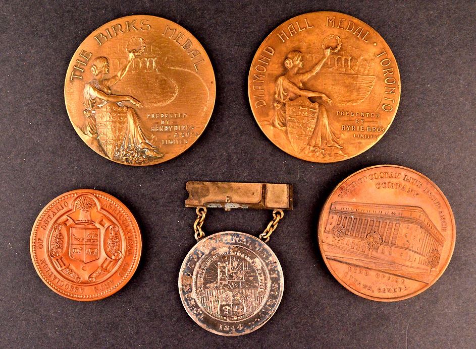 Agricultural and Arts Association of Ontario, 1870-1895, Ae, 42mm, Lr.1462, McL 268, CH#EONA-9, unnamed, by G.Ward, variety 2, EF; Ryrie Brothers, Diamond Hall Medal, Toronto, 1897-1924, Ae, 57mm, CH#5315-5, presented "for best Carriage Stallion, Any Age", date of award unspecified, Good Fine; The Birks Medal, Ae, 57mm, CH#5025-5-1, unnamed, VF; Toronto Typographical Union, No.91, 1844, Ar, 39mm, CH#3045-10, unnamed, FIne; Metropolitan Life Insurance Company, 1928, Ae, 50.5 mm, CH#5255-5, VF; total of 5 medals.