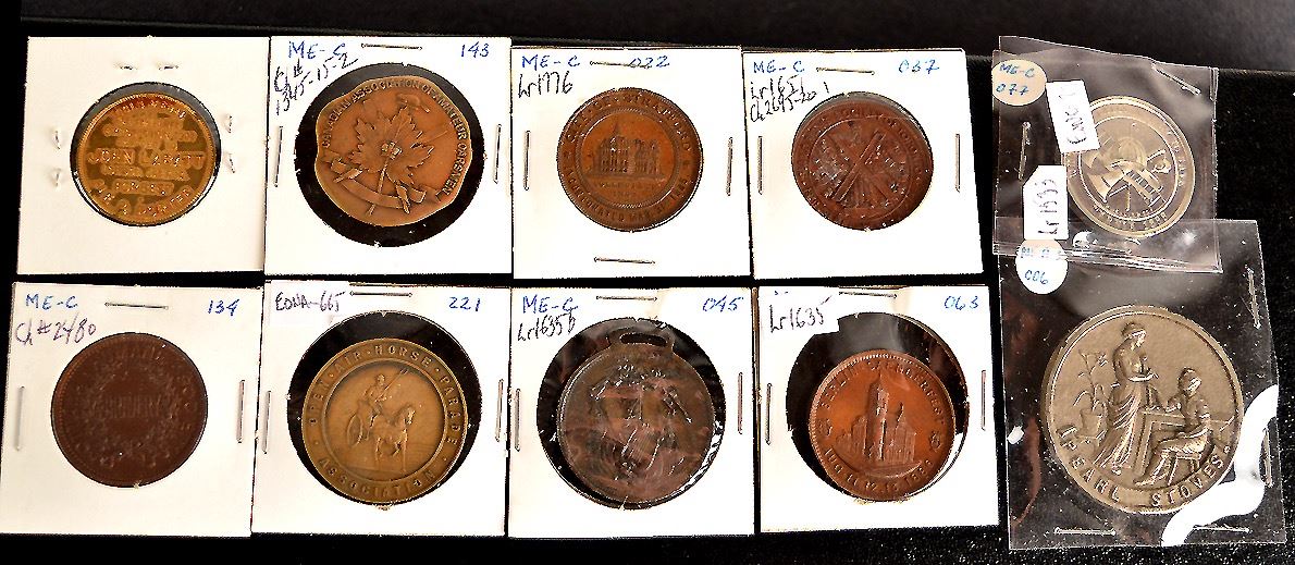 (1)- Grand International Firemens Tournament, Sarnia, 1888, Lr.1533, CH#EONA-75, Wm, EF; (2)- Berlin Saengerfest, 1886, Lr.1635, Ae, EF; (3)- 1st Peninsular Saengerfest, Hamilton, 1891, Lr.1635b, Ae, VF; (4)- St. Andres Society of Toronto, 1886, Lr.1651, CH#2695-20-1, Ae, VF; (5)- City of Stratford, 1885, Lr.1776, Ae, EF; (6)- Open Air Horse Parade Association, CH#EONA-665, Ae, VF; (7)- Canadian Association of Amateur Oarsmen, CH#1345-15-2, Ae, VF; (8)- Ottawa Humane Society, Bravery, CH#2480, Ae, EF: (9)- Pan-American Exposition, 1901, gold Medal, awarded to John Labatt, London, Canada, Brass, CH#5225, VF; (10)- The Moffat Stove Co. Ltd. Weston, Ont., Pearl Stove, Iron, 44mm, hanger broken off, poor; total 10 medals.