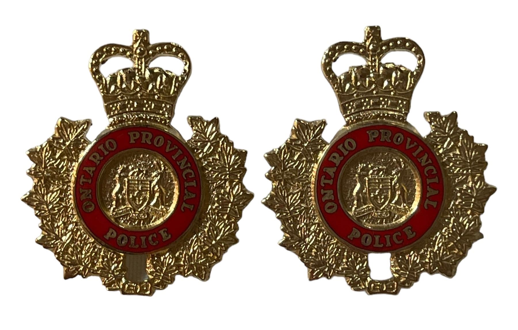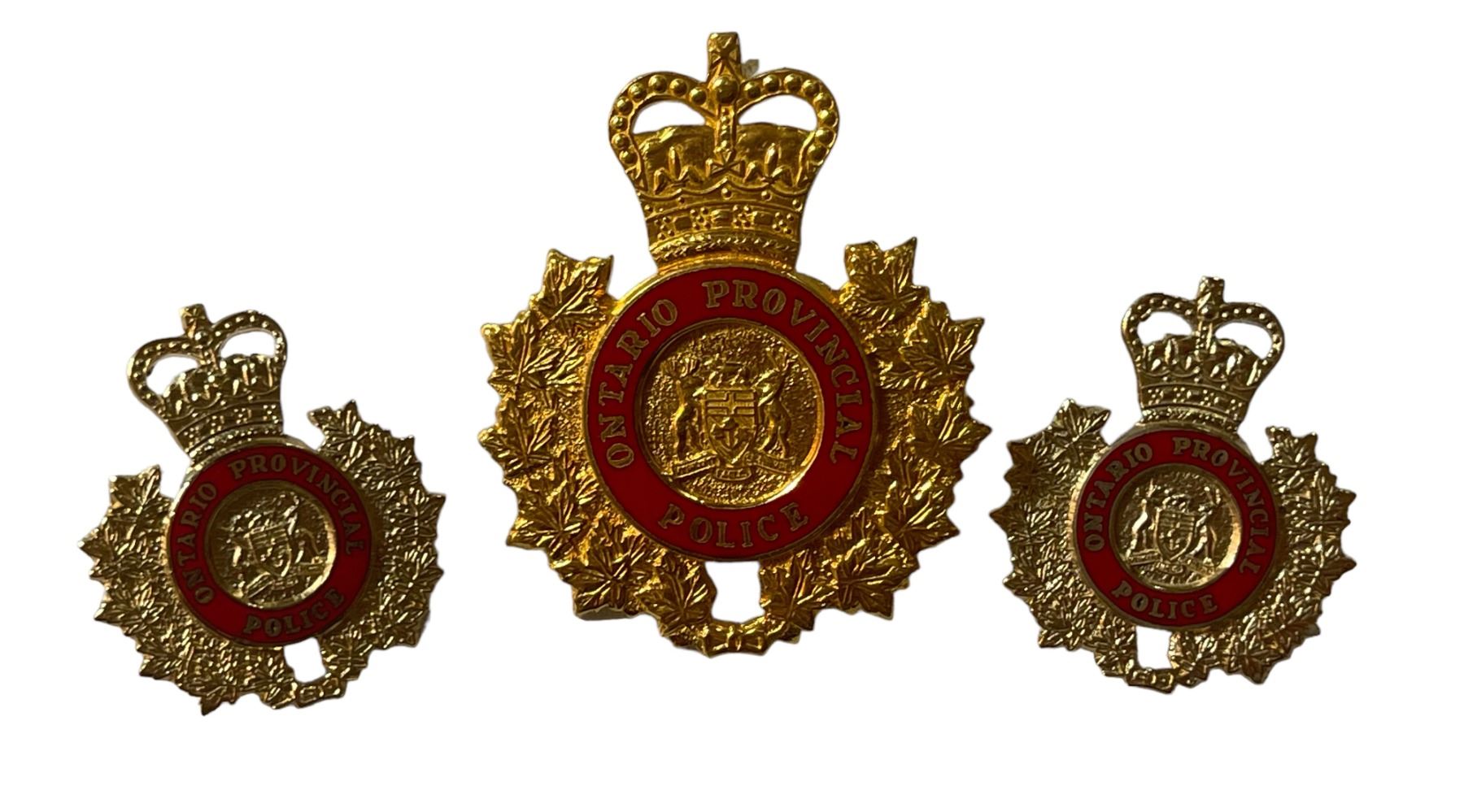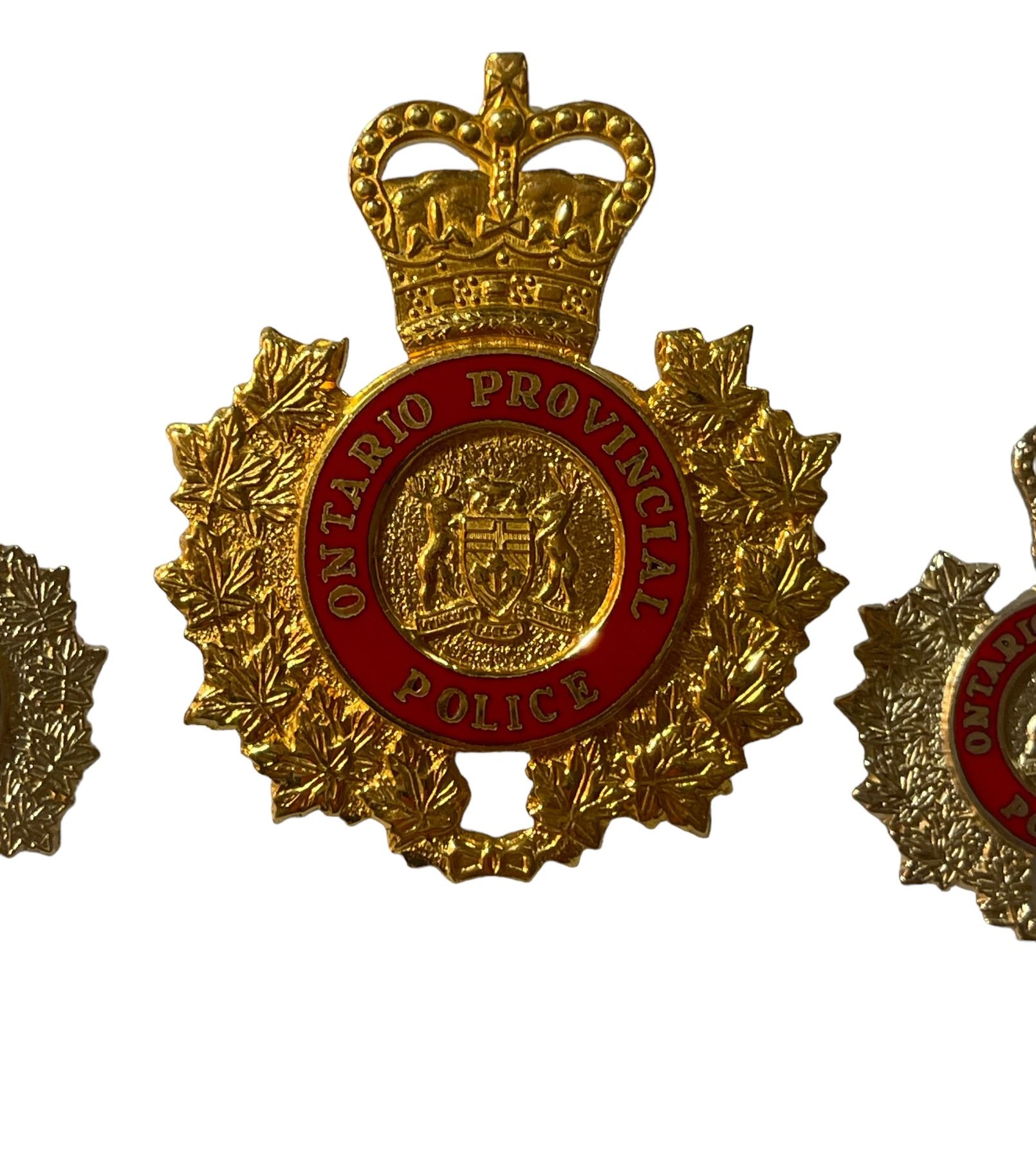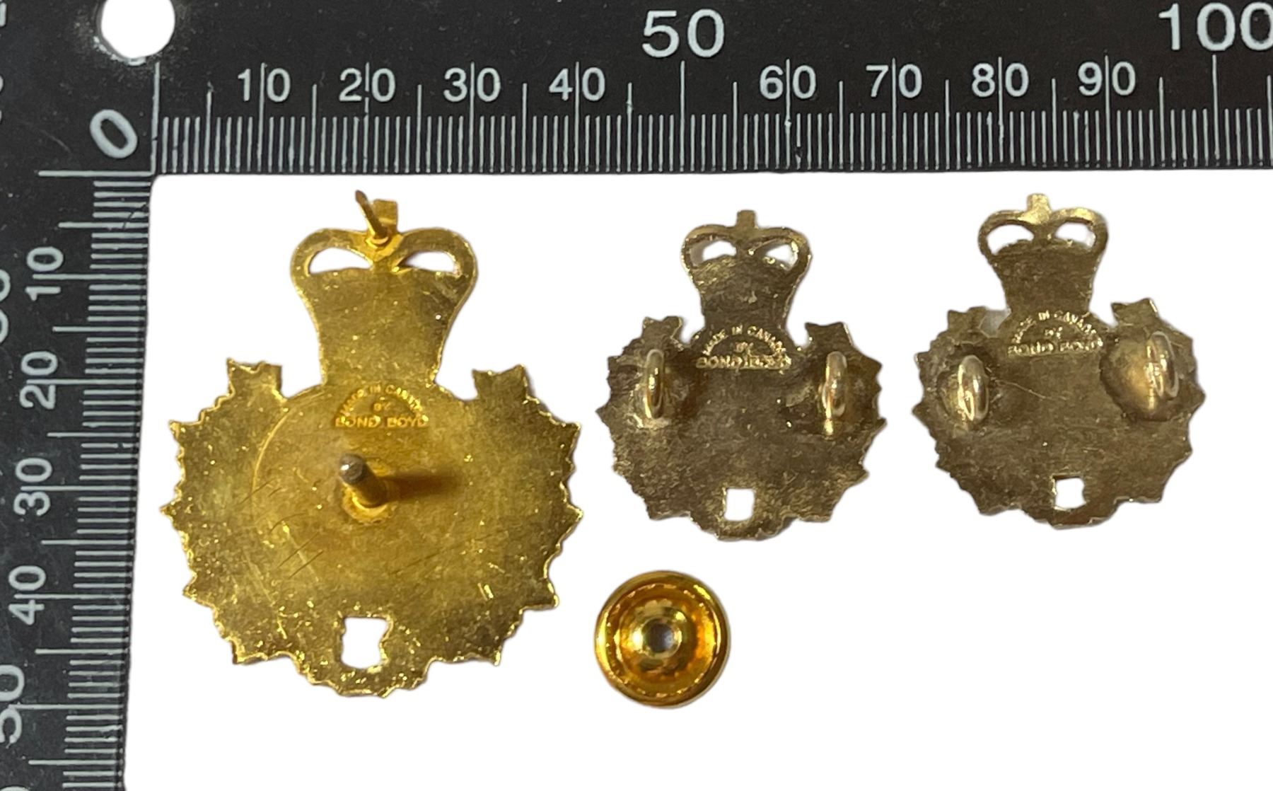 Lot of 3. Cap Badge and Collar Pair. Bright brass metal with red enamel.