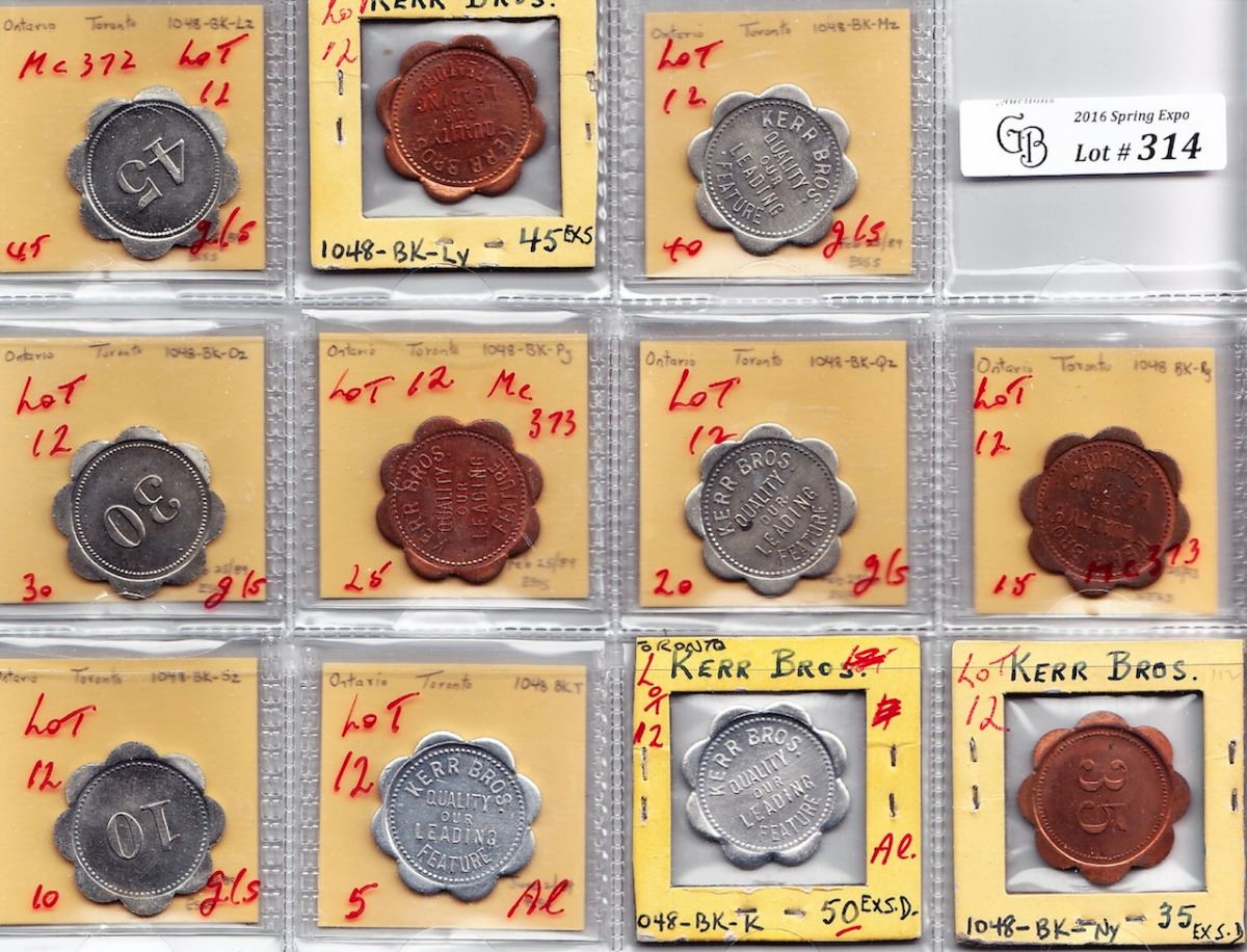 Includes: See Mc 372 and 373, Bo 1048-BK-K, Ly, Lz, etc., Kerr Bros., Toronto, set in mix of aluminum, copper, and german silver: 50 in alum., 45 in both g/s and copper (2 Pcs.), 40 in g/s, 35 in copper, 30 in g/s, 25 in copper, 20 in g/s, 15 in copper, 10 in g/s, 5 in alum., Copper and g/s 50 struck of each. AU. 11 Pcs.
