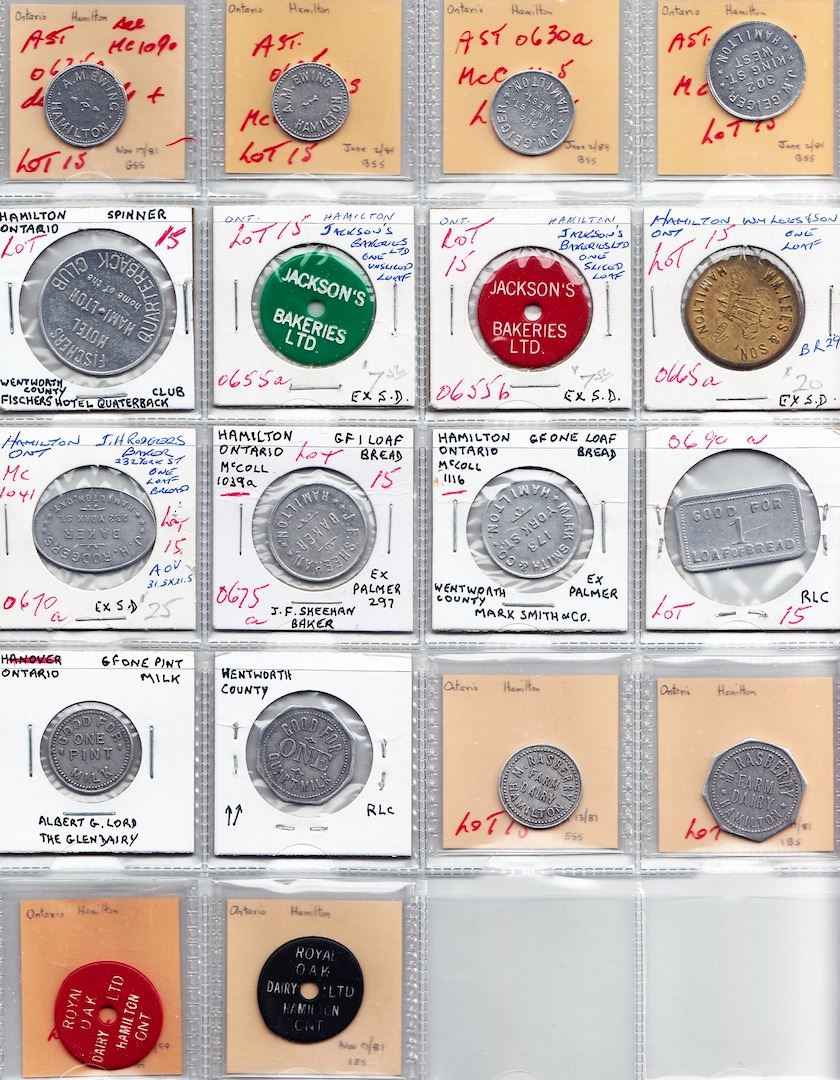Includes: As 0625a, Mc 1090, A.M. Ewing, Hamilton, rev: 1 Loaf, var. with diamonds and dots; As 0625c, Mc 1090, as previous, var. with stars; As 0630a, Mc 1105, J.W. Geiger, Hamilton, rev: One Half Loaf; As 0630c,Mc 1105, as previous, rev: ONE Loaf; As 0655a and b, Jackson's Bakery, Hamilton, rev: One unsliced and one sliced loaf, green and red plastic; As 0665a, Wm. Lees & Son, Hamilton, rev: One Loaf; As 0670a, Mc 1041, J.H. Rodgers, Hamilton, rev: ONE Loaf; As 0675a, Mc 1039a, J.F. Sheehan, Hamilton, rev: ONE Loaf; As 0685a, Mc 1116, Mark Smith, Hamilton, rev: ONE Loaf; As 0690a, Sunshine Bread, Hamilton, rev: 1 Loaf; Albert G. Lord The Glen Dairy Hamilton, rev: One Pint Milk and One Quart Milk, 2 Pcs.; M. Raspberry Farm Dairy Hamilton, rev: One Pint and One Quart Milk, 2 Pcs.; Royal Oak Dairy Hamilton, rev: 1 Quart Standard Milk, red plastic; as previous, rev: One Half Pint 18% Cream, black plastic; Fischers Hotel Hamilton, Home of The Quarterback Club spinner. VF-AU. 18 Pcs.