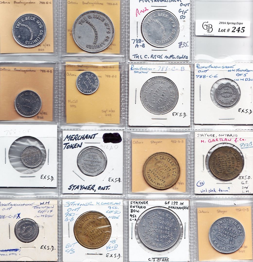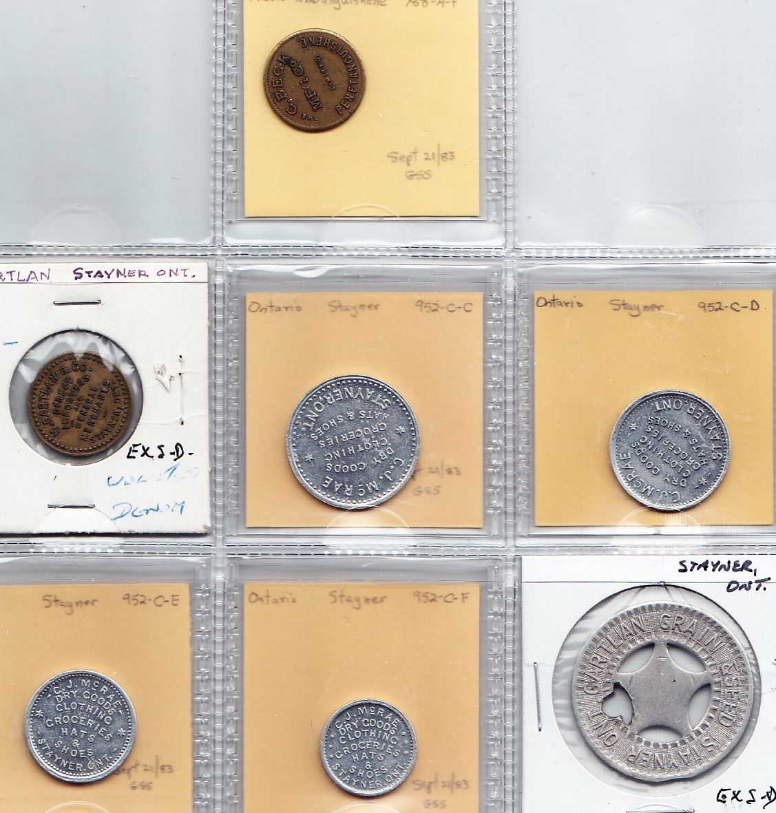 Includes: Bo 788-A-A to A-F C. Beck Penetanguishene Rev: 1.oo, 50, 25, 10c, 5c and 1c; Bo 788 C-B C-E to C-Fx W.M. Thompson Penetanguishene Rev: 50, 5, 1 and 1c; Bo 952-A-D Bell & McEachern Stayner Rev: 10; Bo 952-B-B M. Gartlan Stayner Rev: 50; as previous Rev: 25 and 5; as Bo 952-B-B but c/s VOID on rev; Bo 952-C-A to C-F C.J. Mc Rae Stayner Rev: 1.oo, 50, 25, 10, 5 and 1; made at an exhibition Gartlan Grain & Seed Stayner Ont. F to EF. 22 Pcs.