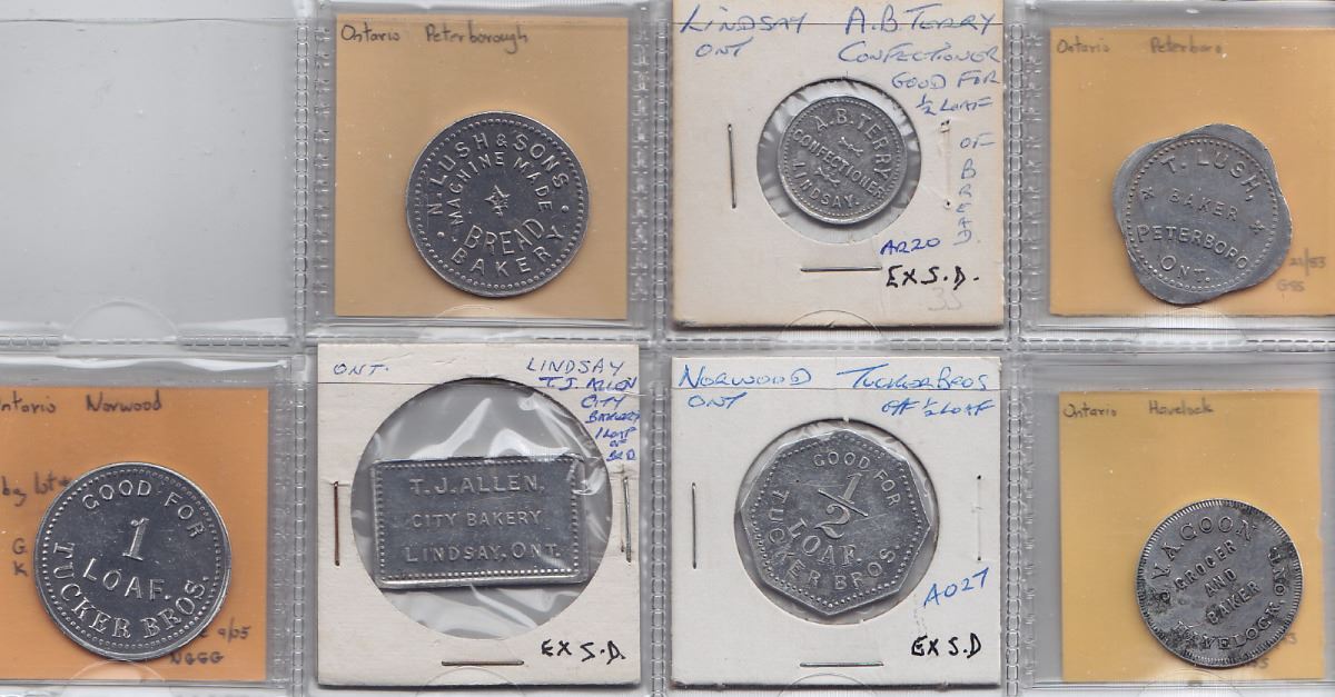 Includes: As 0725a J.V.A. Coon Havelock small loaf; As 1140a Tucker Bros. (Norwood) 1/2 loaf; As 1140b Tucker Bros 1 loaf; As 1330a N. Lush & Sons (Peterborough) 1 small loaf; As 1385a T. Lush Peterboro 1 loaf; As 0875a T.J. Allen Lindsay 1 loaf; As 0880a A.B. Terry 1/2 loaf. F to EF. 7 Pcs.
