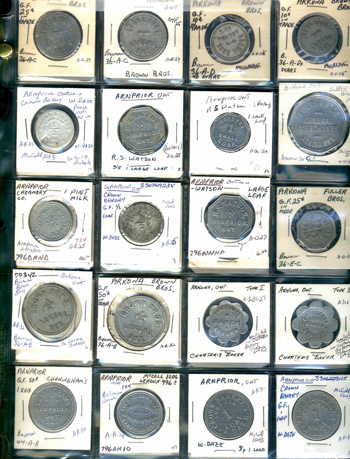 Ontario. Various dairy and merchant tokens from the following locals: Arkona, Arnprior. (28 pieces)