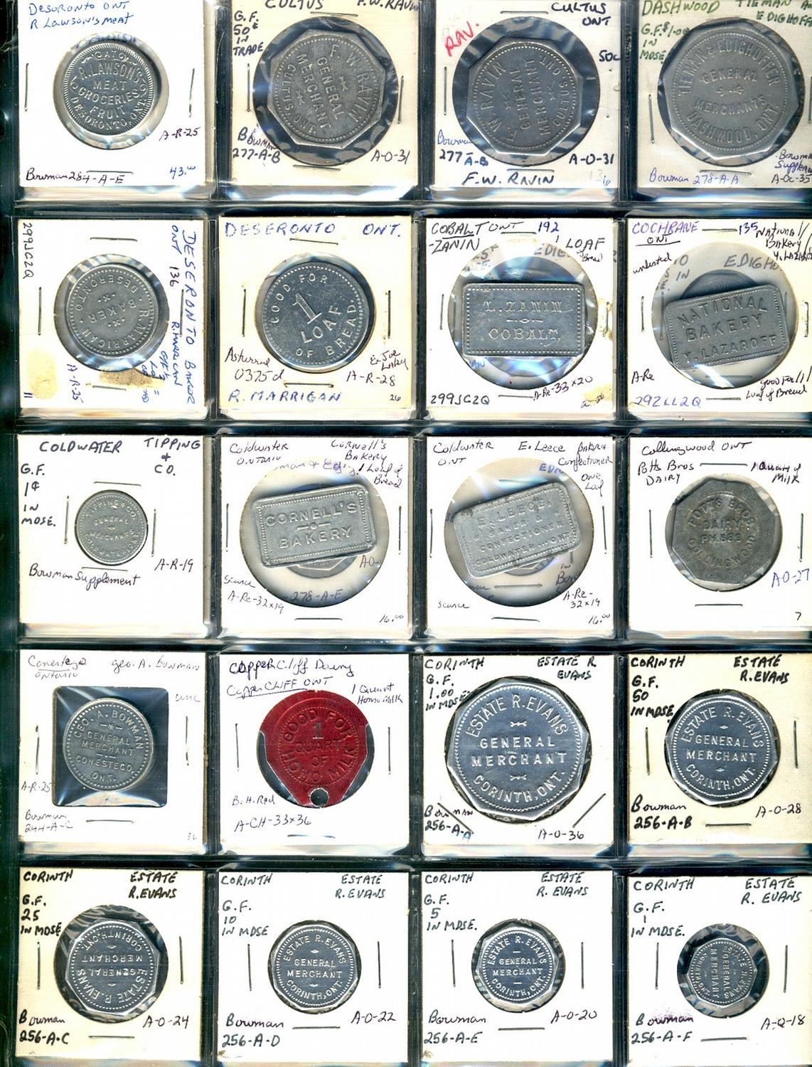 Ontario. Various dairy and merchant tokens from the following locals: Cobalt, Coldwater, Collingwood, Conestego, Copper Cliff, Corinth, Cranbrook, Cultus, Dashwood, Dehli, Desoronto. (28 pieces)