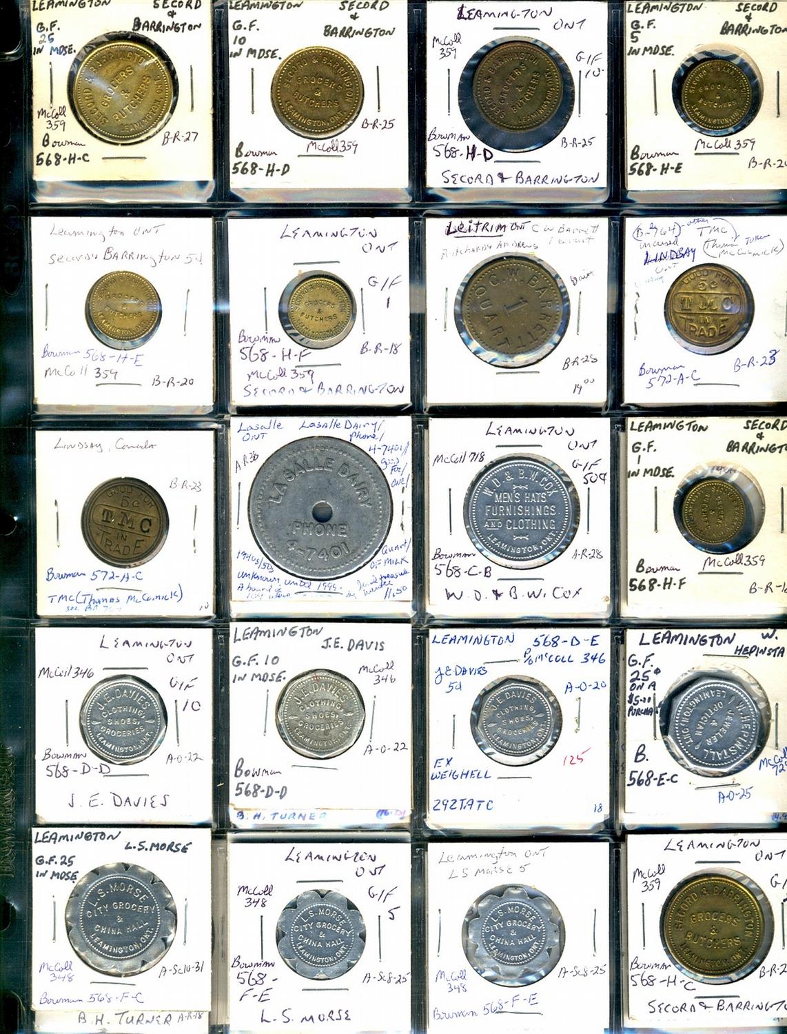 Ontario. Various dairy and merchant tokens from the following locals: Lasalle, Leamington, Leitrim,