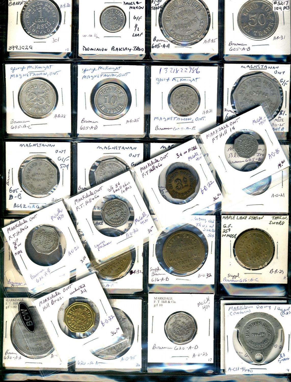 Ontario. Various dairy and merchant tokens from the following locals: Lucknow, Magnetawan, Maple Lake Station, Markdale, Makham. (26 pieces)