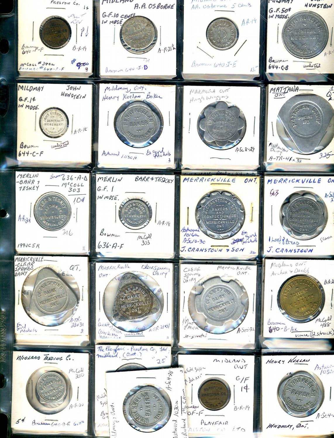 Ontario. Various dairy and merchant tokens from the following locals: Marmora, Mattawan, Merlin, Merrickville, Midland, Mildway, Midmay. (37 pieces)
