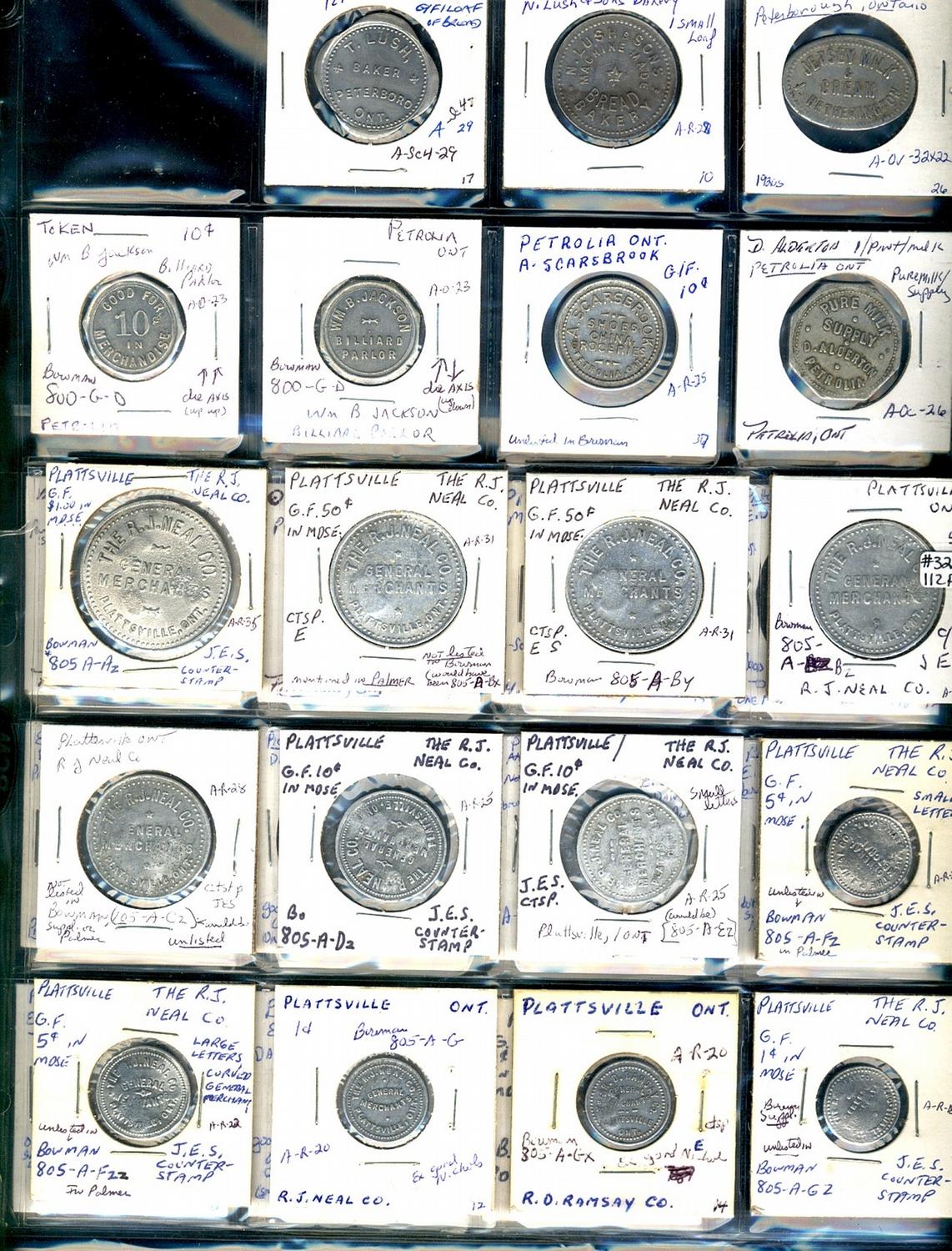 Ontario. Various dairy and merchant tokens from the following locals: Peterborough, Petrolia, Pickering, Picton, Plattsville. (33 pieces)