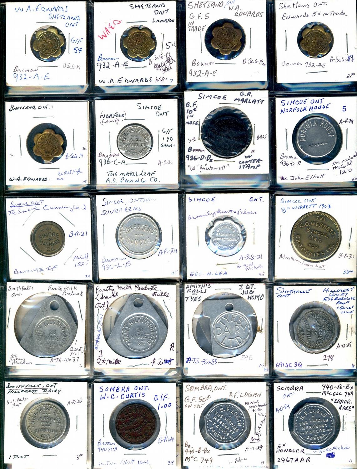 Ontario. Various dairy and merchant tokens from the following locals: Shetland, Simcoe, Smith's Falls, Smithville, Sombra. (28 pieces)