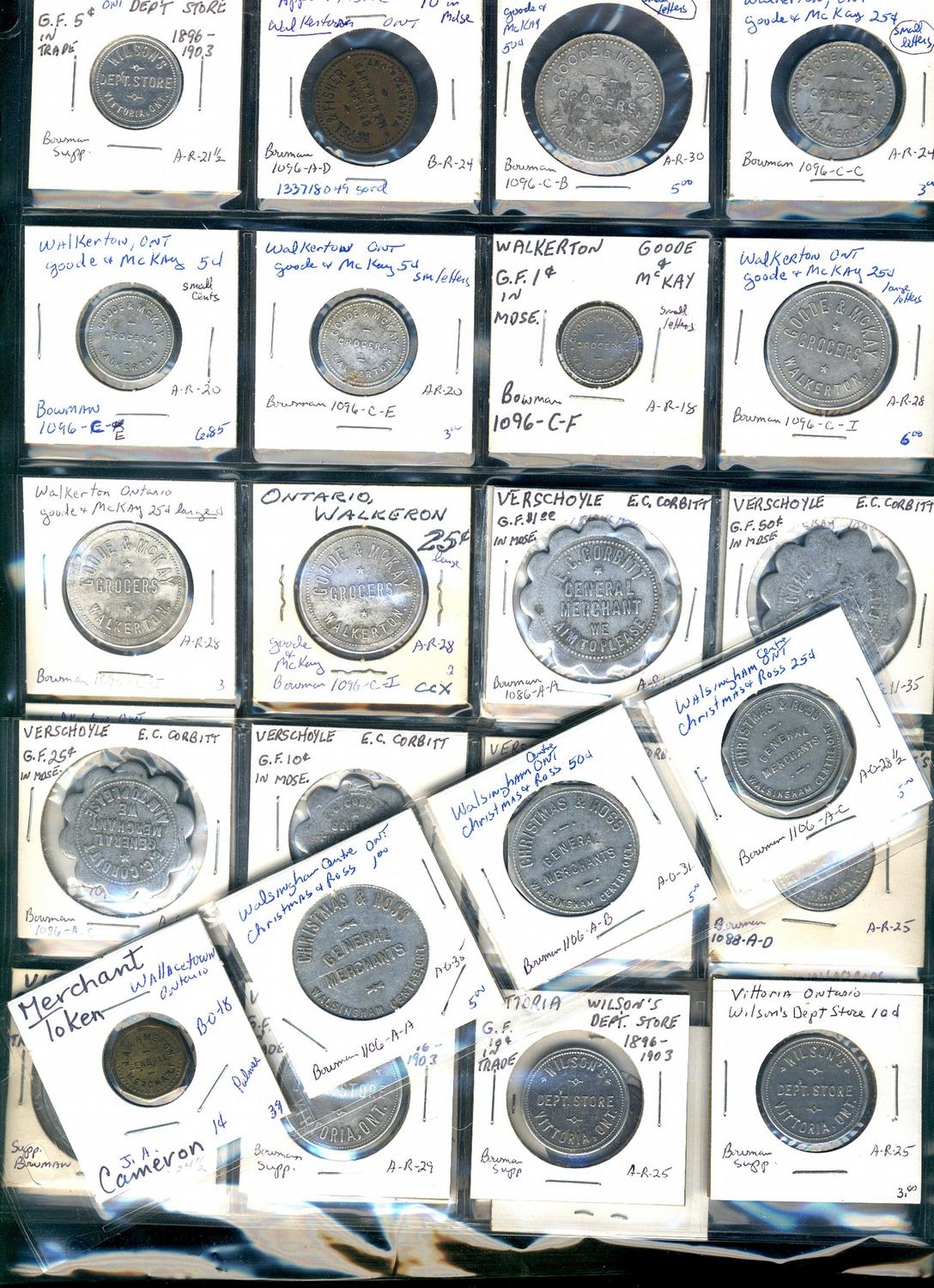 Ontario. Various dairy and merchant tokens from the following locals: Verschoyle, Vittoria, Walkerton, Wallaceburg, Wallacetown, Walsingham. (36 pieces)