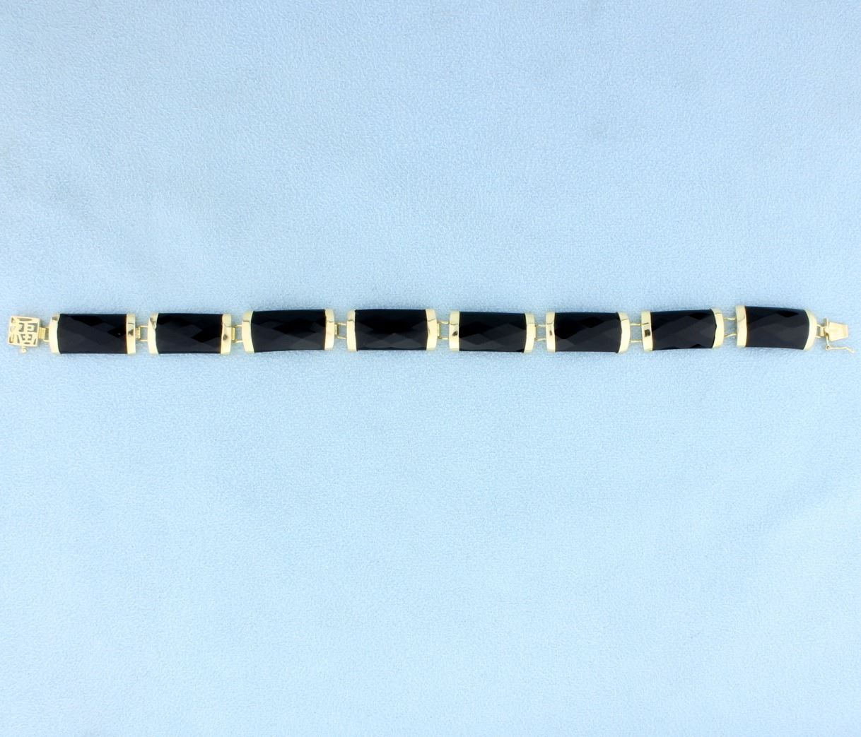 In 14K yellow gold, this bracelet is 7 inches long, there are eight 16x9mm onyx gemstones. It has a safety clasp with Chinese Character for good fortune. 10.7g