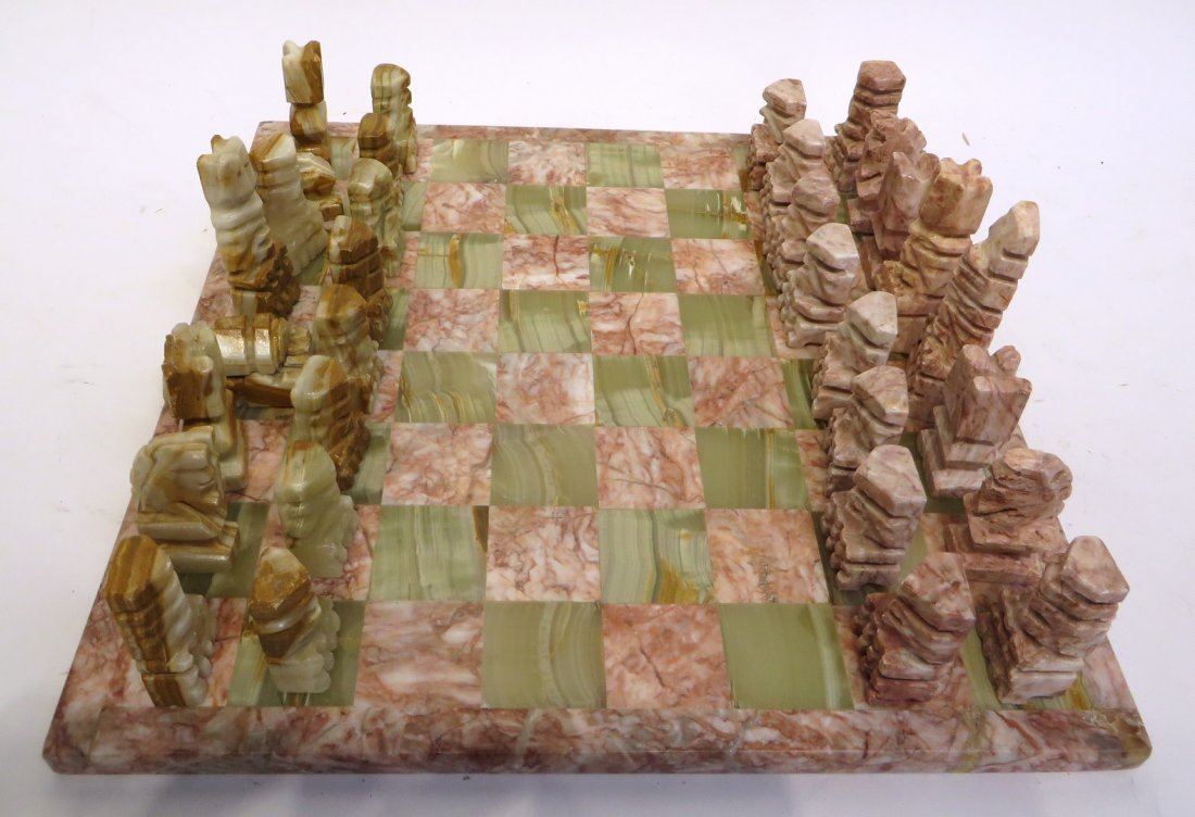A chess set made of onyx and marble. Pink marble and green onyx pieces. Two knights and one king are damaged. NO RESERVE on this lot. Most items in this sale have no reserve Only 20 lots in this sale have reserves, marked with "R" at end of description.