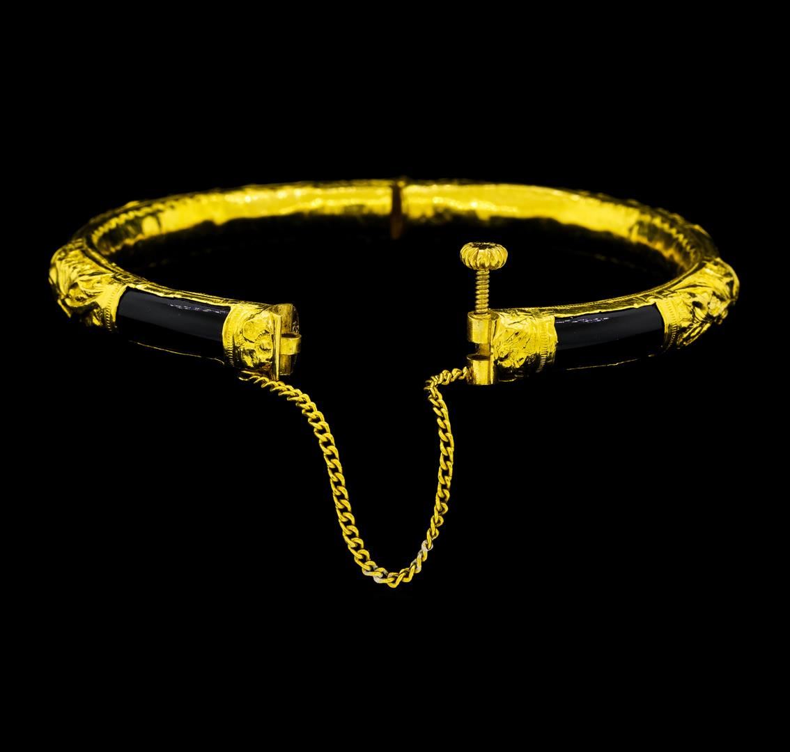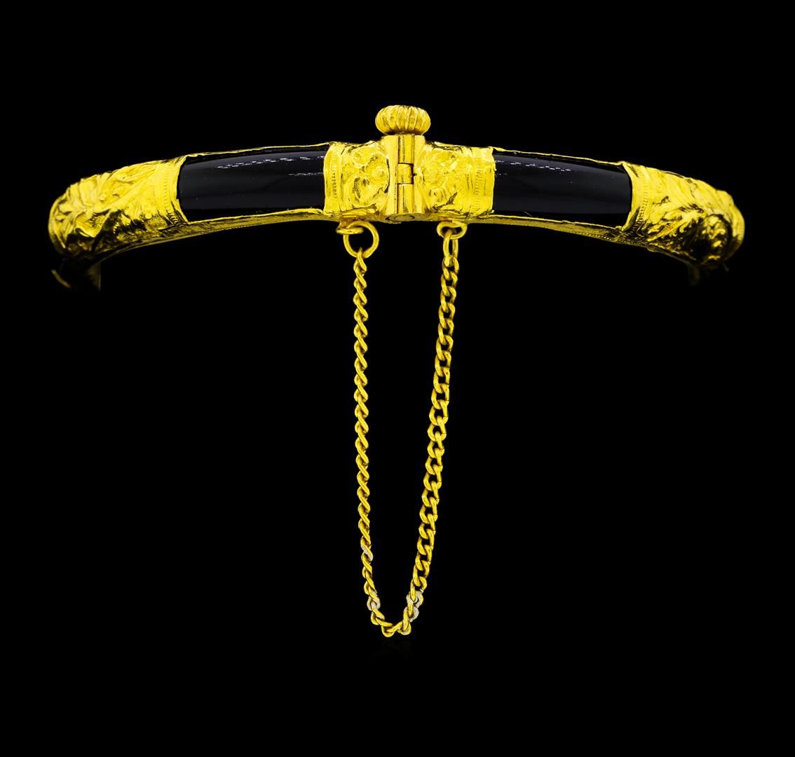 One lady's bangle bracelet with an attached three inch safety chain featuring: 22KT yellow gold weighing 21.6 grams containing six pieces of inlaid onyx.