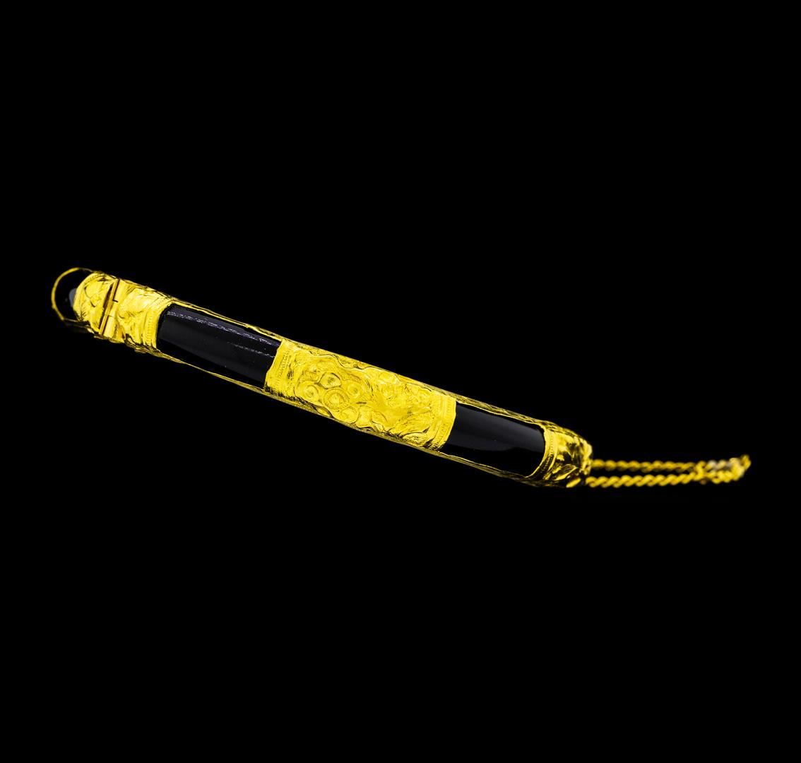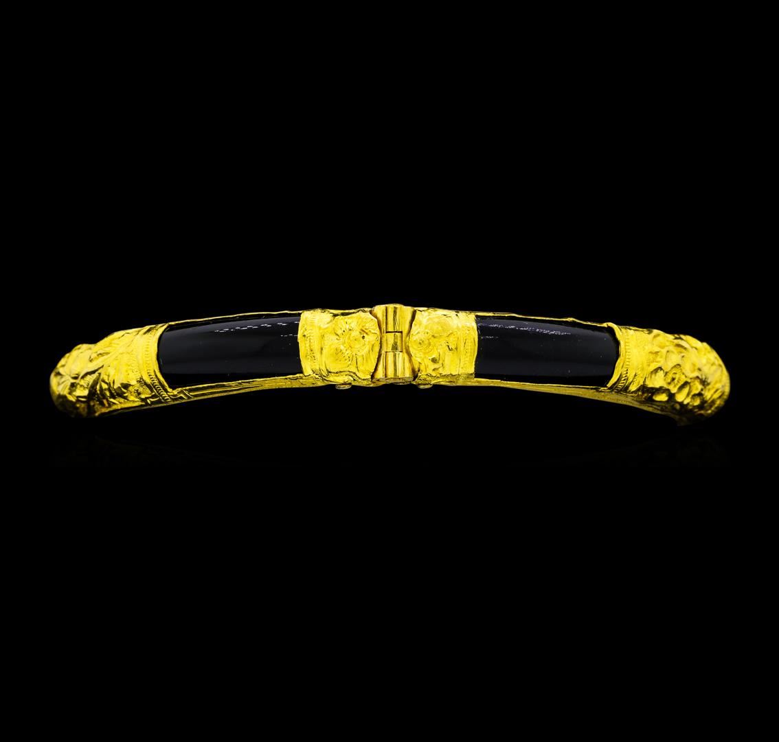 One lady's bangle bracelet with an attached three inch safety chain featuring: 22KT yellow gold weighing 21.6 grams containing six pieces of inlaid onyx.