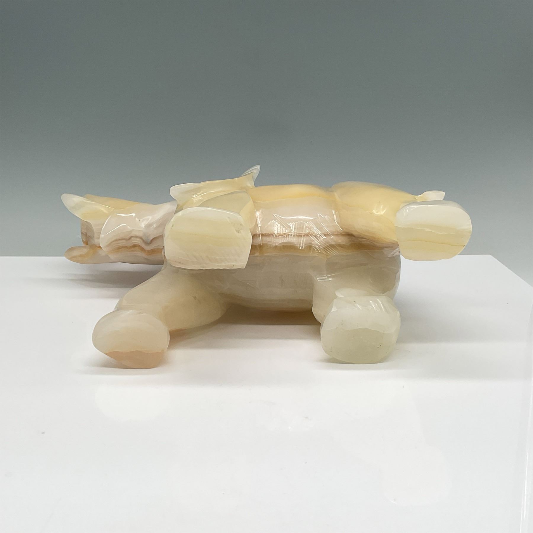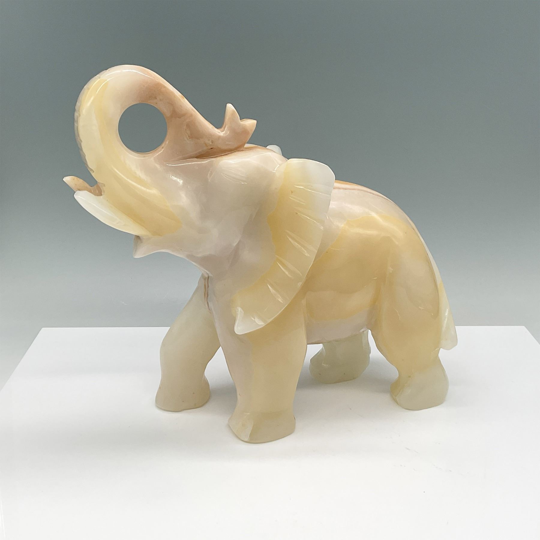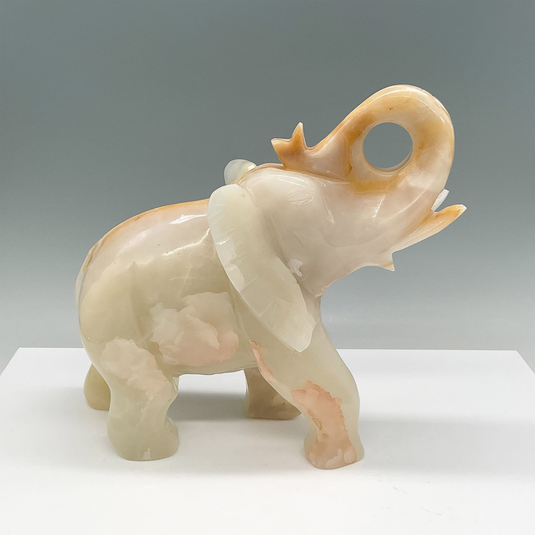Exquisite hand-carved onyx elephant figurine featuring stunning natural coloration in cream and amber tones. The elephant stands with its trunk raised, symbolizing good luck and fortune in many cultures. The natural striations and translucence of the onyx enhance its beauty, making this a captivating decorative piece. The figurine is meticulously polished to a glossy finish, showcasing the skill of its craftsmanship.