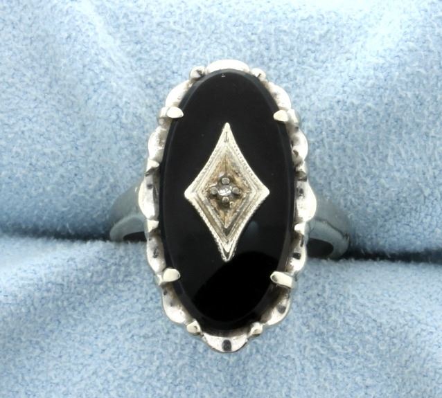 In 10K white gold, this ring contains a .01 ct diamond and a 20x10mm oval shaped onyx gemstone. Size 6 1/4 4.6g