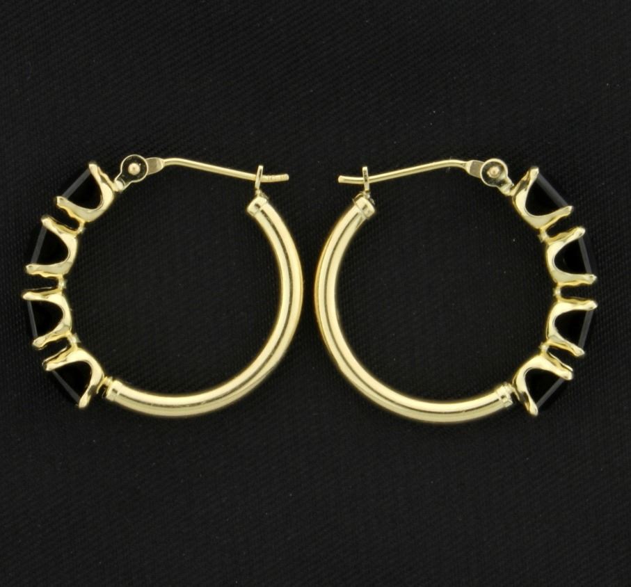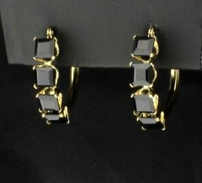 In 14K yellow gold, each earring contains four 4mm square onyx gemstones. They are 3/4 inch long. 1.9g