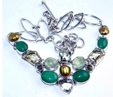 Silver and Onyx,Prenite, Pearl & Citrine Necklace. Allow 6 to 8 weeks for delivery.