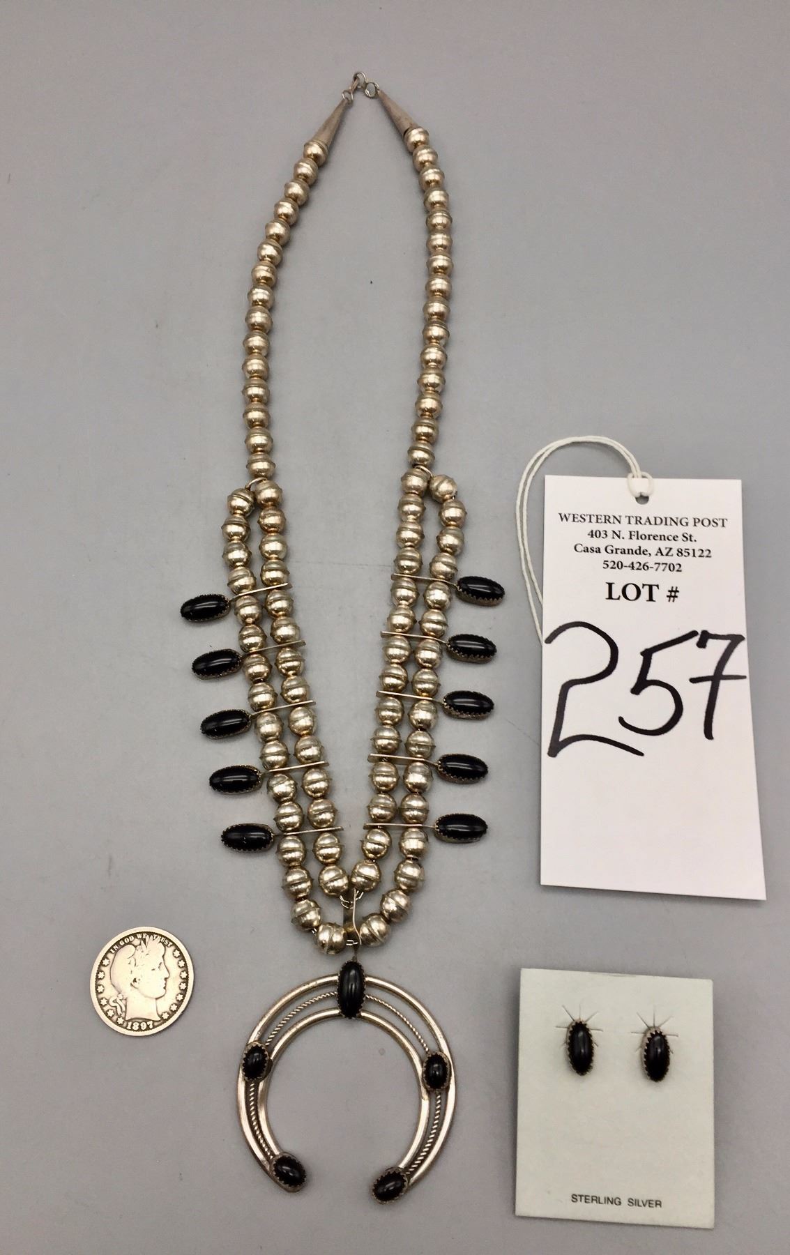 Description: Onyx and sterling silver squash blossom necklace with matching earrings. Maker: Unknown. Approx. Age: Vintage, circa 1980. Size: 20”around the neck and naja pendant measures 2” l x 2” w. Weighs 48.1 g. Condition: Good for their age, normal wear expected. Please look closely at the pictures - they are an important part of our description. Shipping: There will be a $5 handling / packaging fee for shipping this lot. The actual cost of postage will be added on top of that.