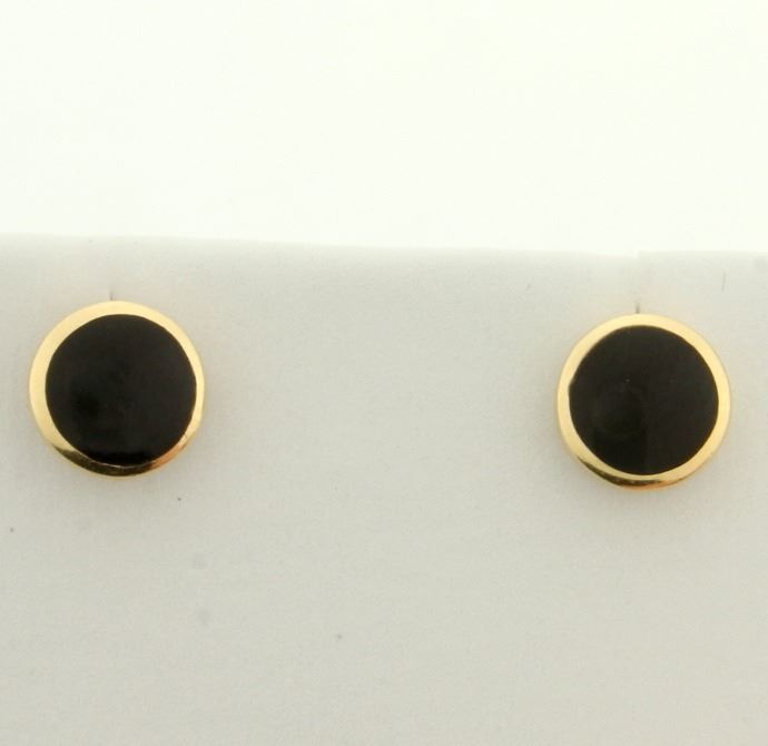 In 14k yellow gold. Each earring contains a 5.5mm natural onyx gemstone. With friction backs. 1.3g.