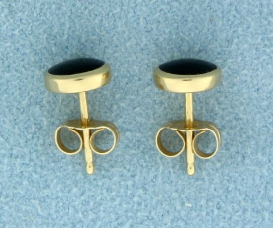 In 14k yellow gold. Each earring contains a 5.5mm natural onyx gemstone. With friction backs. 1.3g.