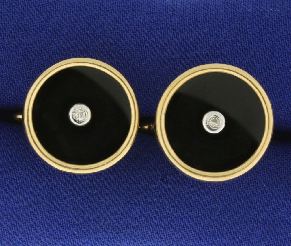 In 14k yellow gold. Each cufflink contains a 15mm round onyx gemstone with a high quality .02ct diamond centered in it. 5/8" diameter. 9.3g.