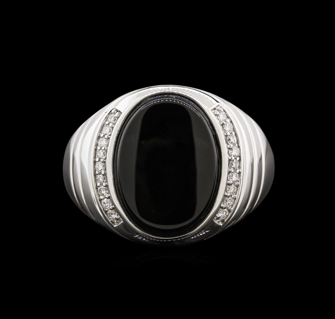 One ring featuring: 14KT white gold weighing 8.60 grams containing a black onyx center stone and diamond side stones with a total diamond weight of 0.22ct.