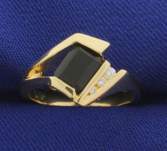 In 14k yellow gold. Contains a natural emerald cut 1ct onyx gemstone and three high quality diamonds: .03ct, .02ct, and .01ct. Diamonds are VS clarity/H color. Size 6 3/4. 5.0g.