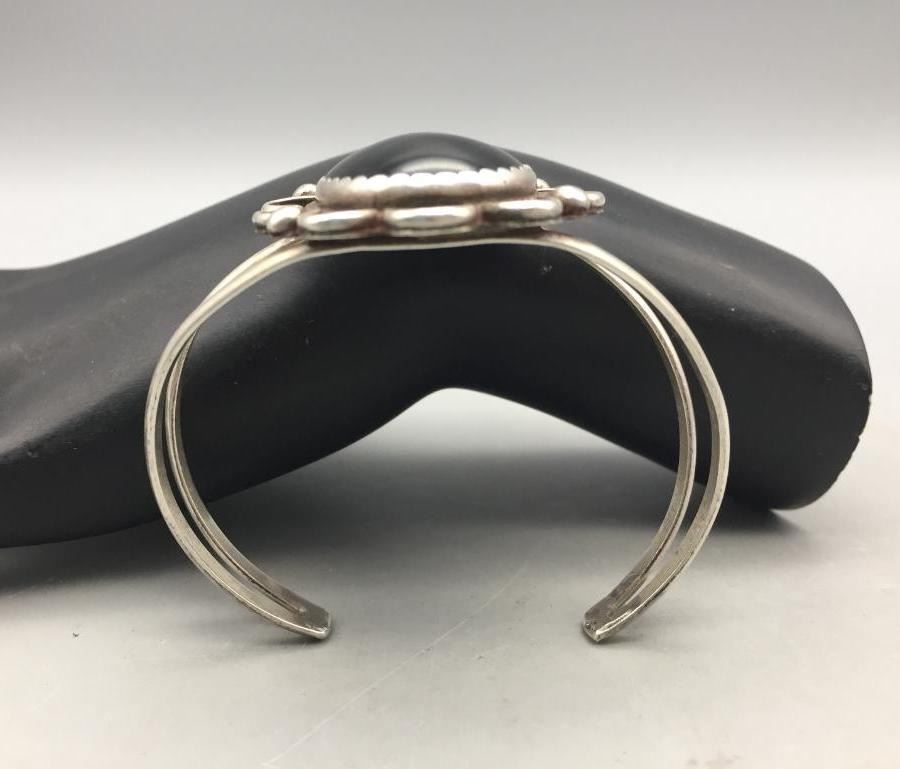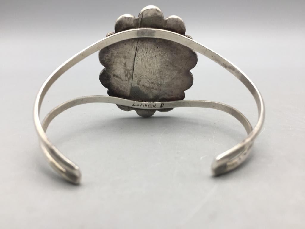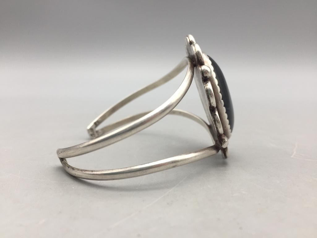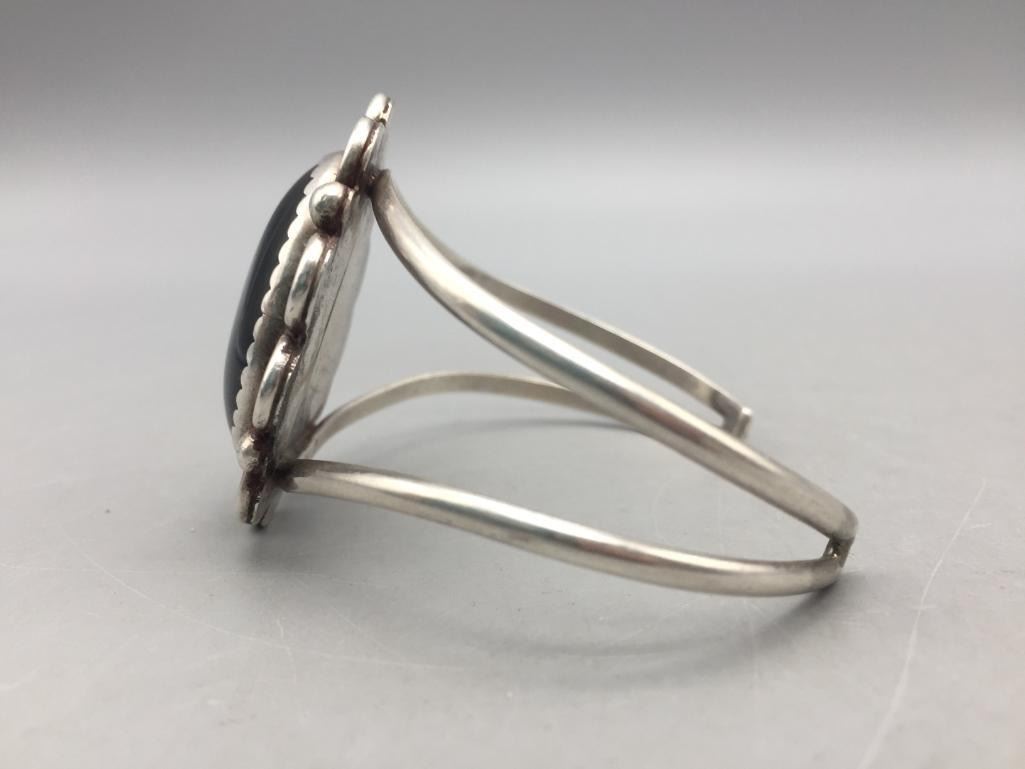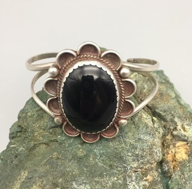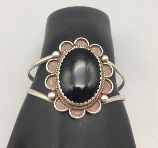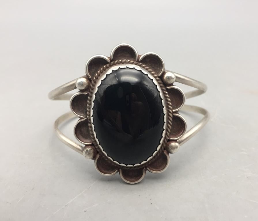 Description: For sale in this lot is a sterling silver bracelet, set with a nice onyx cabochon and floral silver work. Maker: J. Chavez, Jimmie Chavez. Approx. Age: Vintage. Size: Inside circumference measures 5-1/2 inches long. Opening is an additional 1-1/8 inch, fitting a 6-5/8 inch wrist. Width is 1-3/4 inch. Weighs 26 grams. Condition: Good for its age, normal wear expected. Please look closely at the pictures - they are an important part of our description. Shipping: There will be a $5 handling / packaging fee for shipping this lot. The actual cost of postage will be added on top of that.