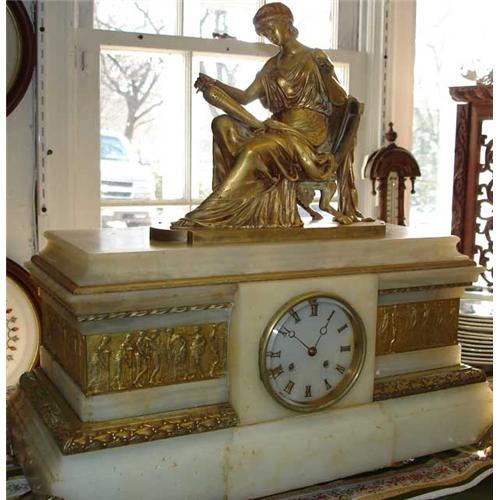 Beautiful signed bronze figure of woman in classical dress atop a large scale onyx and bronze clock .Grand and georgous</em></td>