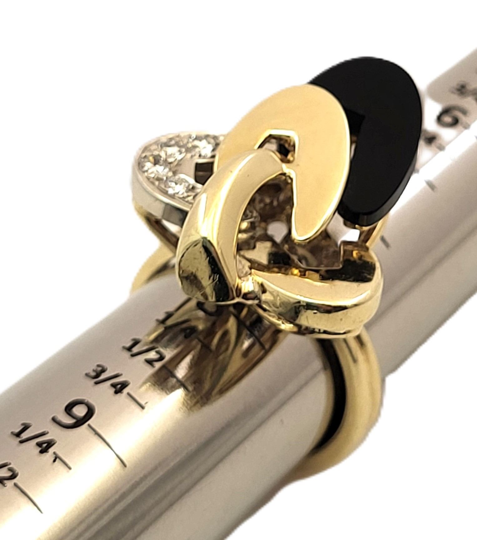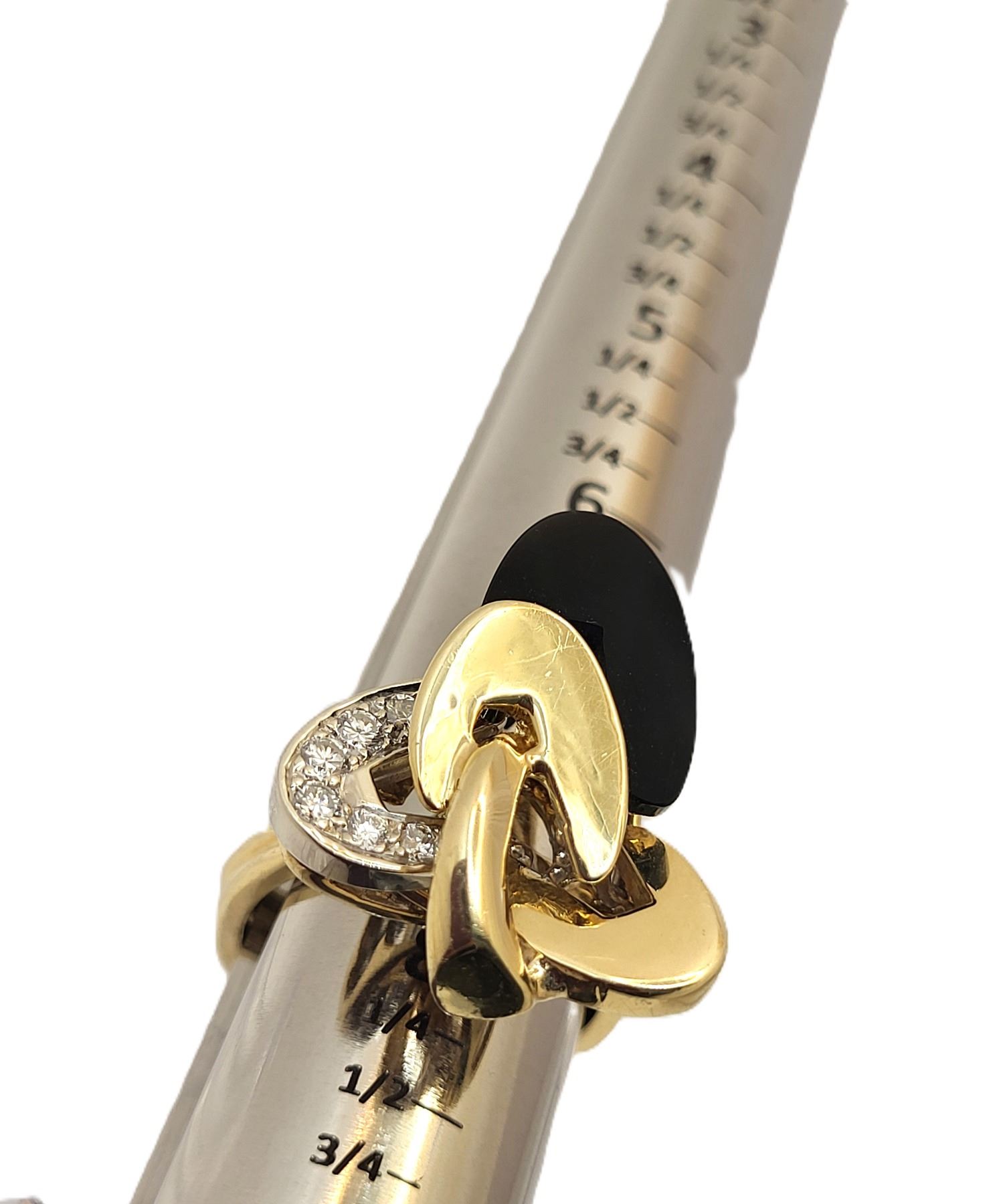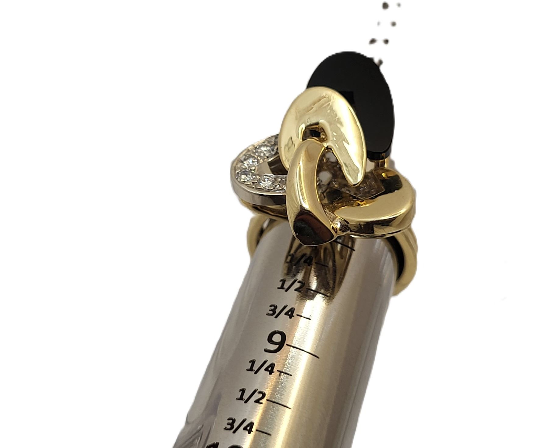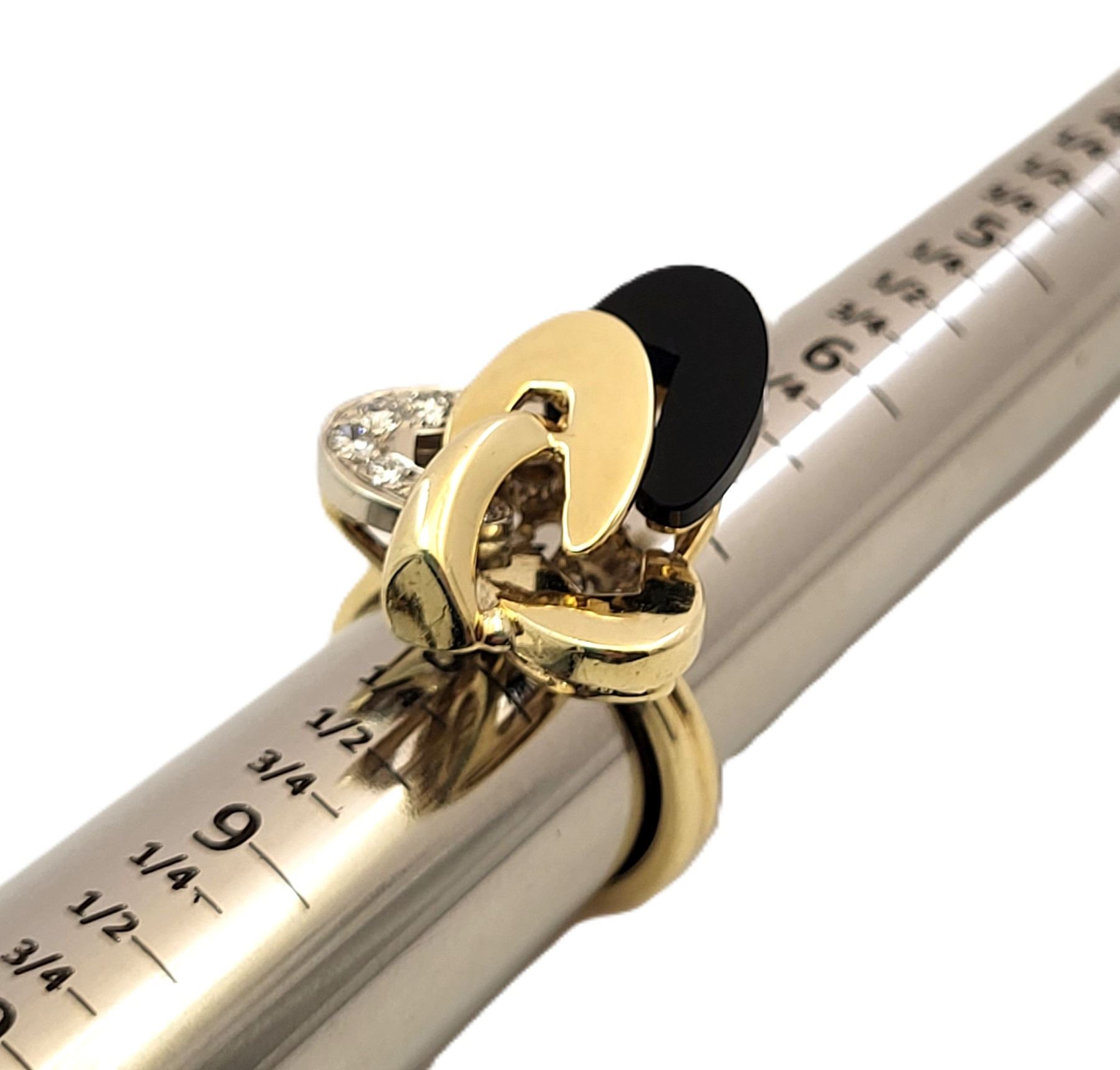 It really appears to always be moving like some superfast electrons around an atom! This 18 karat yellow and white gold ring features an ellipse carved from polished, black onyx and approximately .33 carats of round, brilliant-cut, H color, VS-SI clarity diamonds on the white gold ellipse. The top of this ring is approximately 1 1/8& quot; in diameter between the knuckles of the finger and it has a uniquely carved gallery for support that is attached to the doubled ring shank that tapers from pinched at the top to approximately 5.25mm at the bottom. This ring is US size 9 and can be sized for an additional charge. There is a hallmark that has been obscured. The hallmark is either & quot;R& quot; or ends with & quot;R& quot;.& nbsp; Admin:33110/9tli