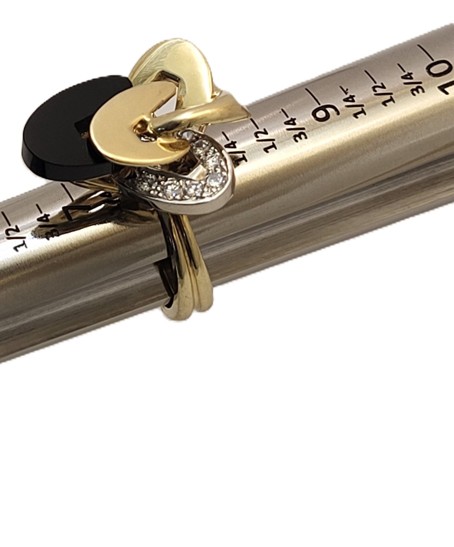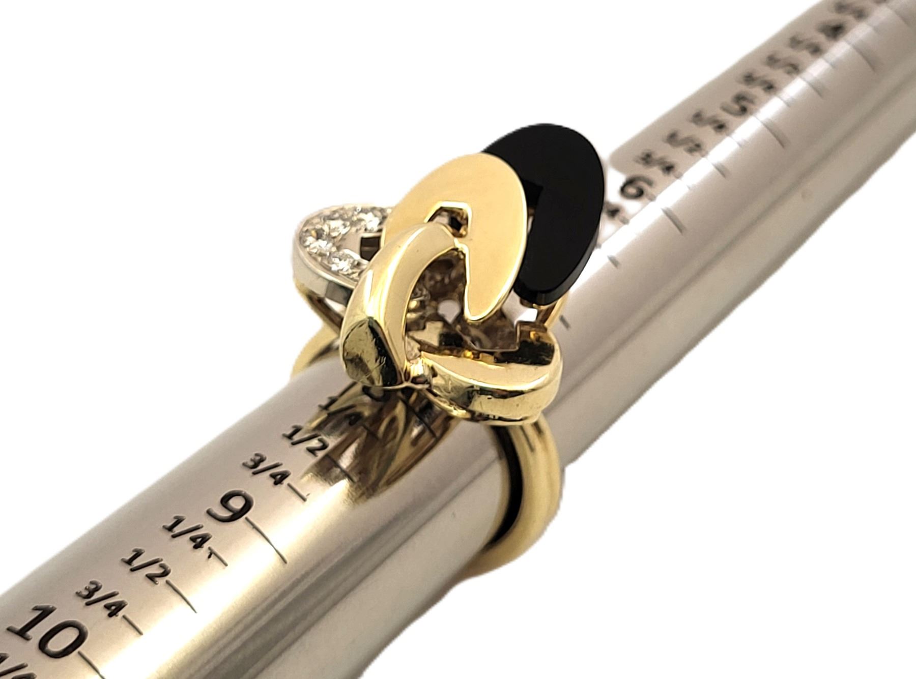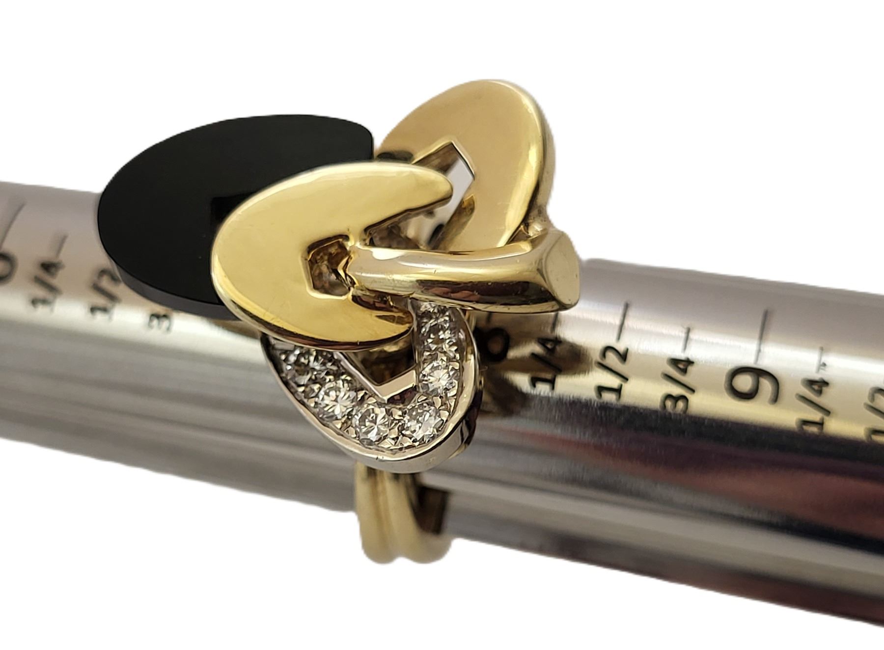 It really appears to always be moving like some superfast electrons around an atom! This 18 karat yellow and white gold ring features an ellipse carved from polished, black onyx and approximately .33 carats of round, brilliant-cut, H color, VS-SI clarity diamonds on the white gold ellipse. The top of this ring is approximately 1 1/8& quot; in diameter between the knuckles of the finger and it has a uniquely carved gallery for support that is attached to the doubled ring shank that tapers from pinched at the top to approximately 5.25mm at the bottom. This ring is US size 9 and can be sized for an additional charge. There is a hallmark that has been obscured. The hallmark is either & quot;R& quot; or ends with & quot;R& quot;.& nbsp; Admin:33110/9tli