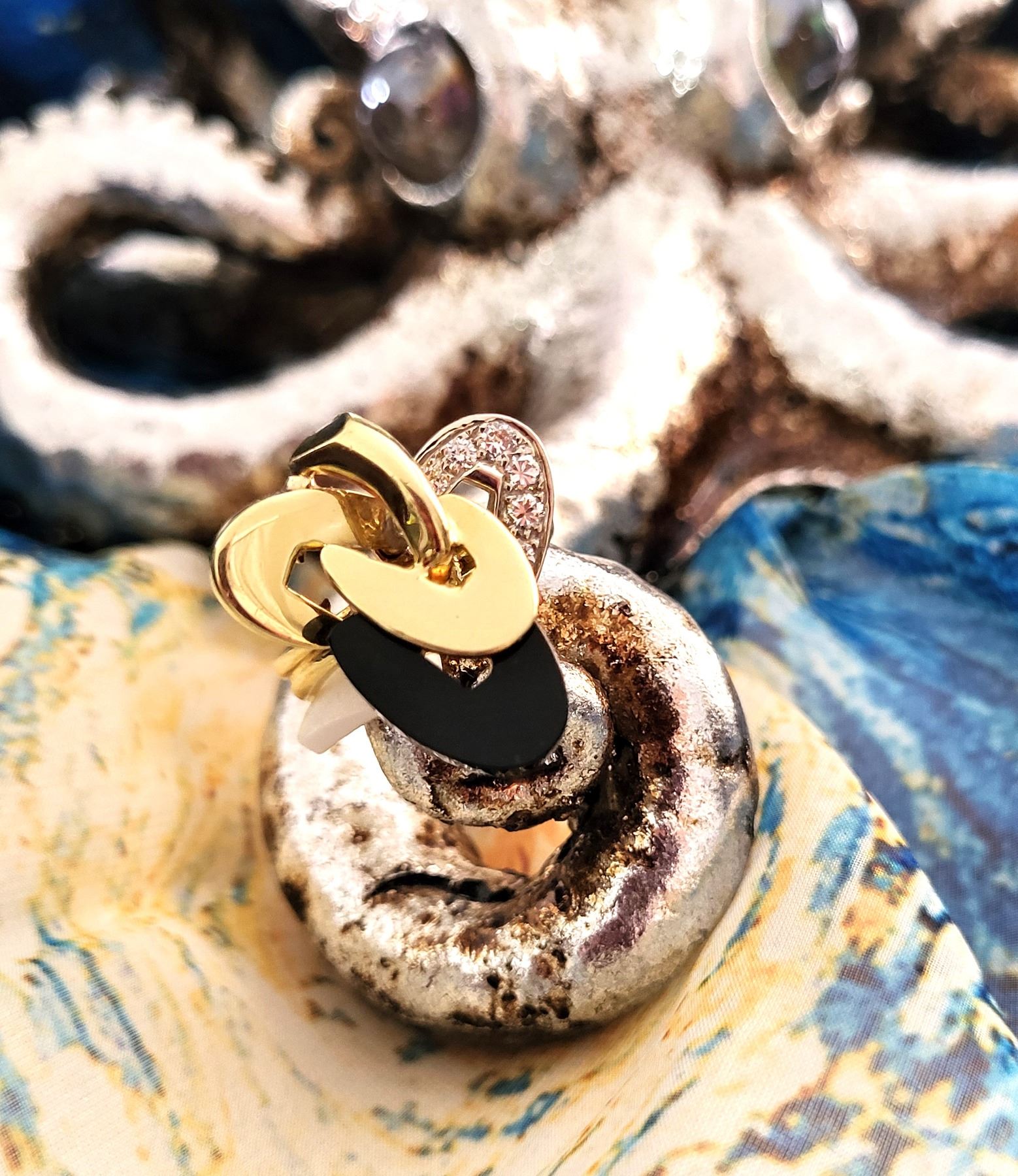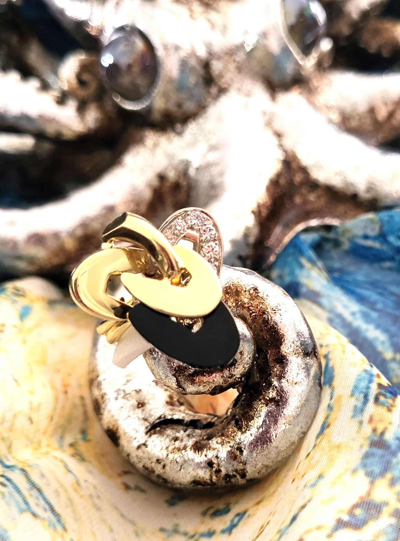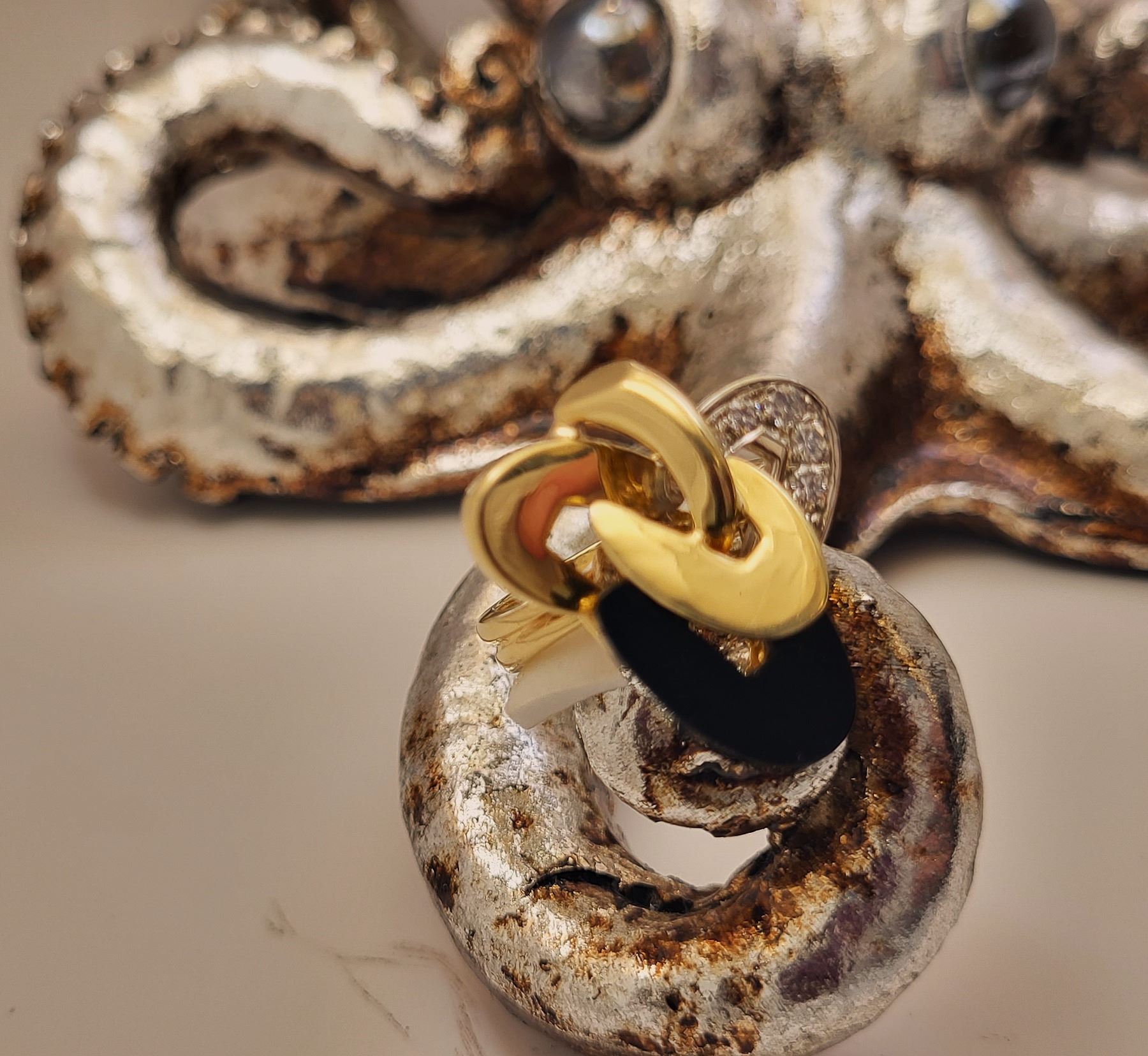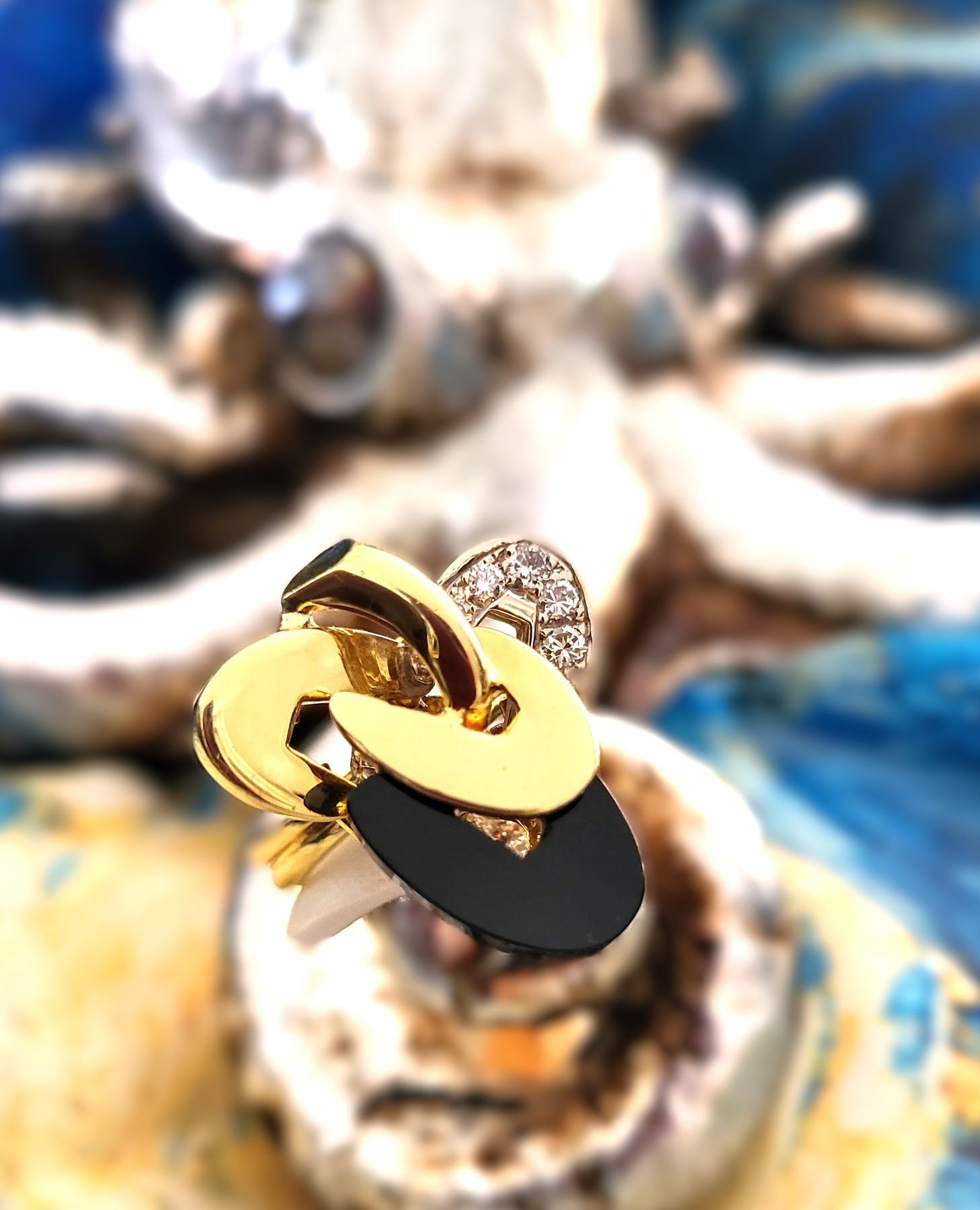 It really appears to always be moving like some superfast electrons around an atom! This 18 karat yellow and white gold ring features an ellipse carved from polished, black onyx and approximately .33 carats of round, brilliant-cut, H color, VS-SI clarity diamonds on the white gold ellipse. The top of this ring is approximately 1 1/8& quot; in diameter between the knuckles of the finger and it has a uniquely carved gallery for support that is attached to the doubled ring shank that tapers from pinched at the top to approximately 5.25mm at the bottom. This ring is US size 9 and can be sized for an additional charge. There is a hallmark that has been obscured. The hallmark is either & quot;R& quot; or ends with & quot;R& quot;.& nbsp; Admin:33110/9tli