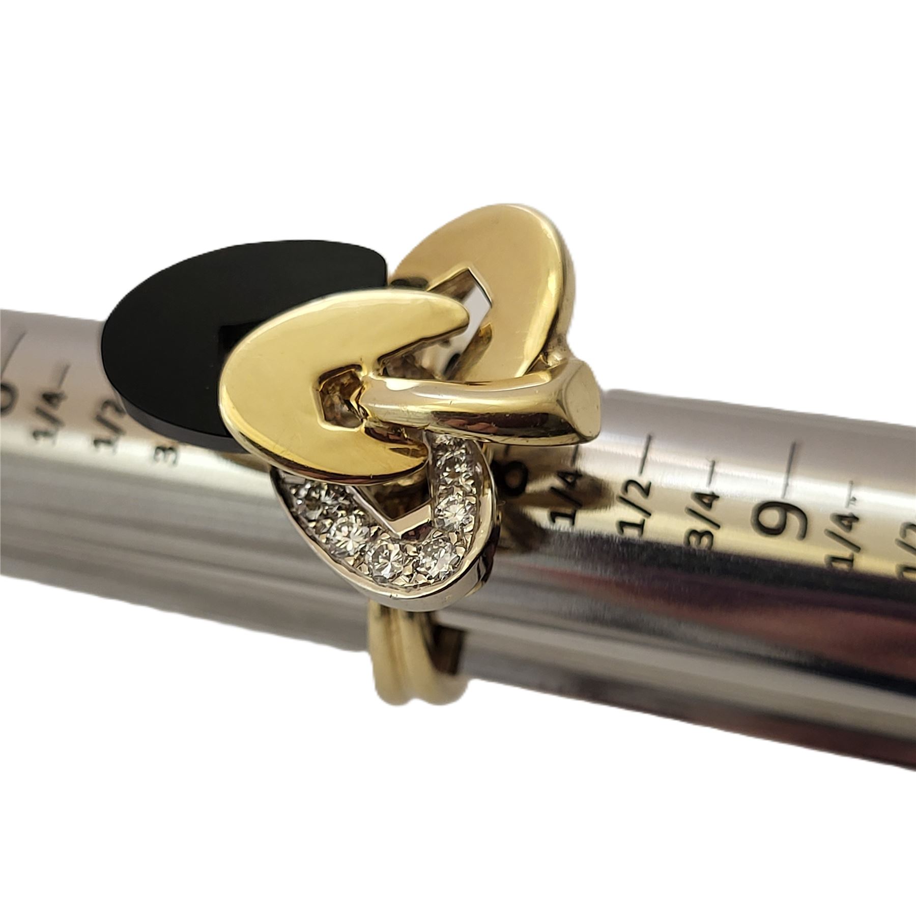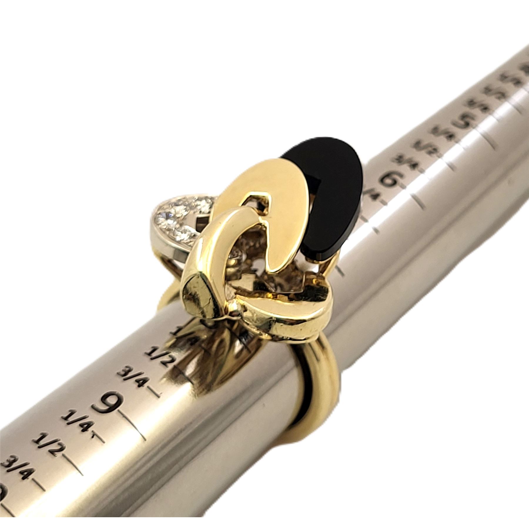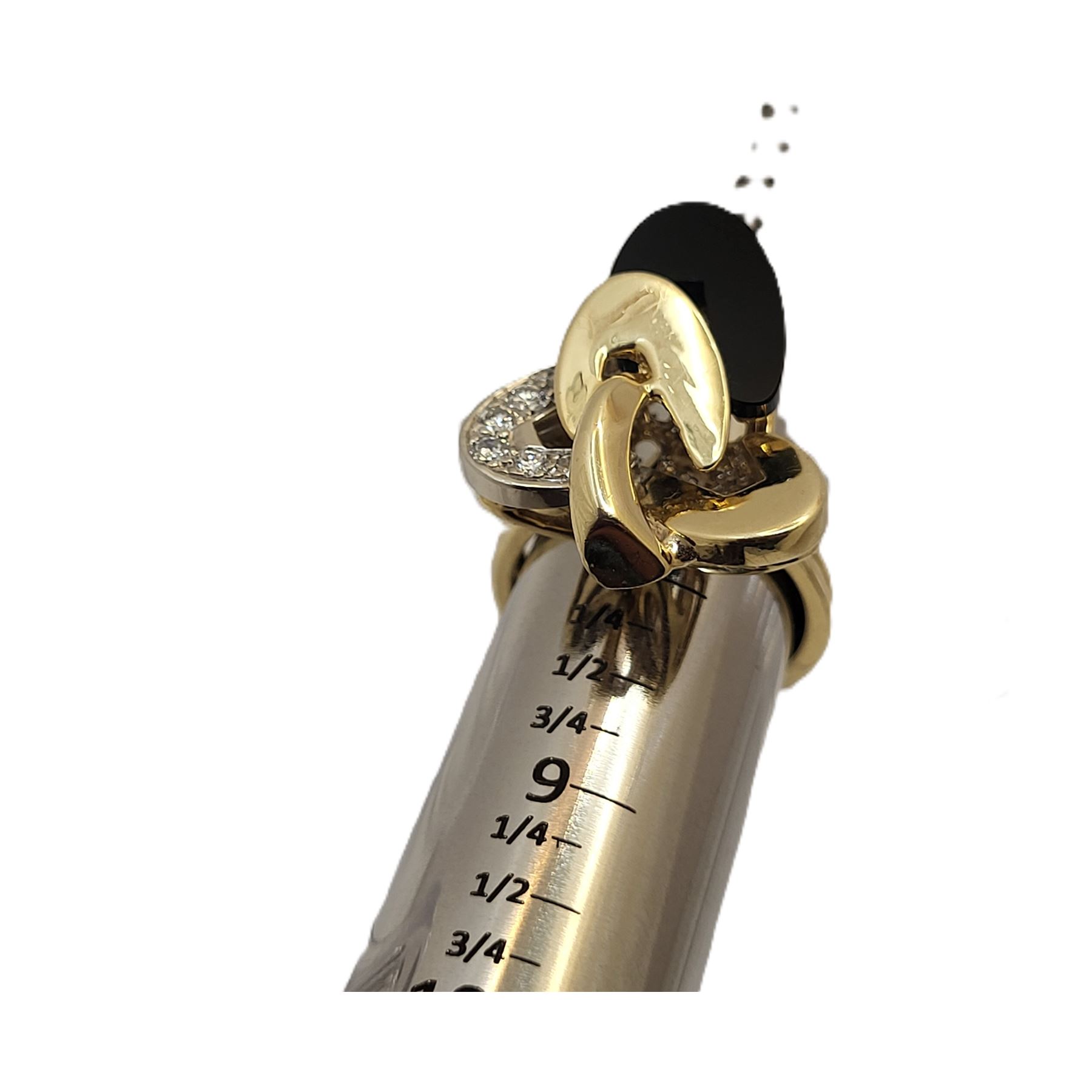 It really appears to always be moving like some superfast electrons around an atom! This 18 karat yellow and white gold ring features an ellipse carved from polished, black onyx and approximately .33 carats of round, brilliant-cut, H color, VS-SI clarity diamonds on the white gold ellipse. The top of this ring is approximately 1 1/8" in diameter between the knuckles of the finger and it has a uniquely carved gallery for support that is attached to the doubled ring shank that tapers from pinched at the top to approximately 5.25mm at the bottom. This ring is US size 9. See below for sizing detail and other information. There is a hallmark that has been obscured. The hallmark is either "R" or ends with "R". See Provenance Information Below. Admin:33110/9tli