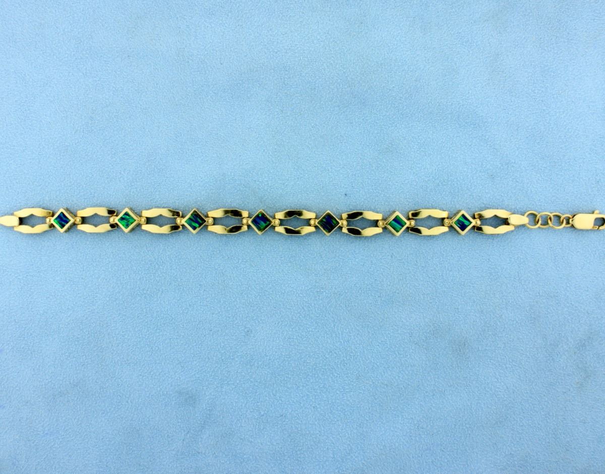 14K yellow gold, it contains seven opal doublets with great play of color in blues & greens. It is 8 inches long with a lobster clasp.    21.2g