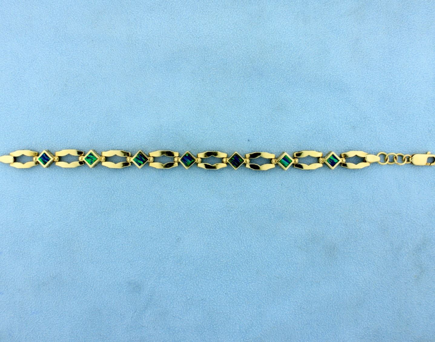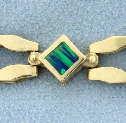 14K yellow gold, it contains seven opal doublets with great play of color in blues & greens. It is 8 inches long with a lobster clasp. 21.2g