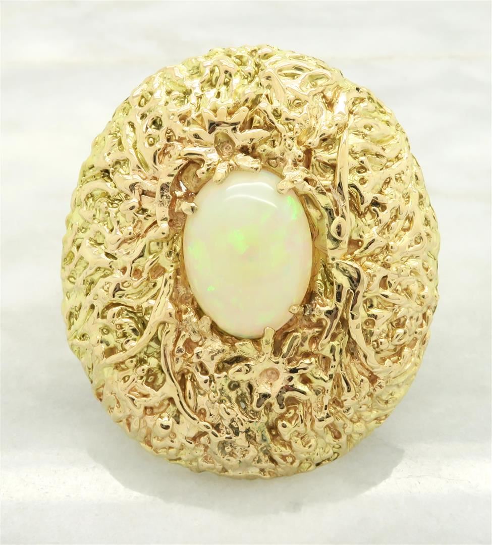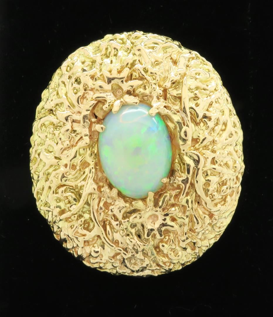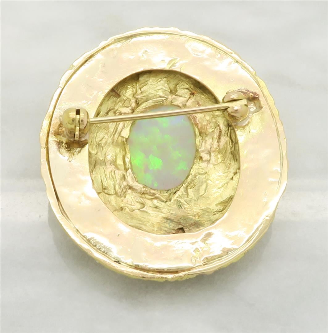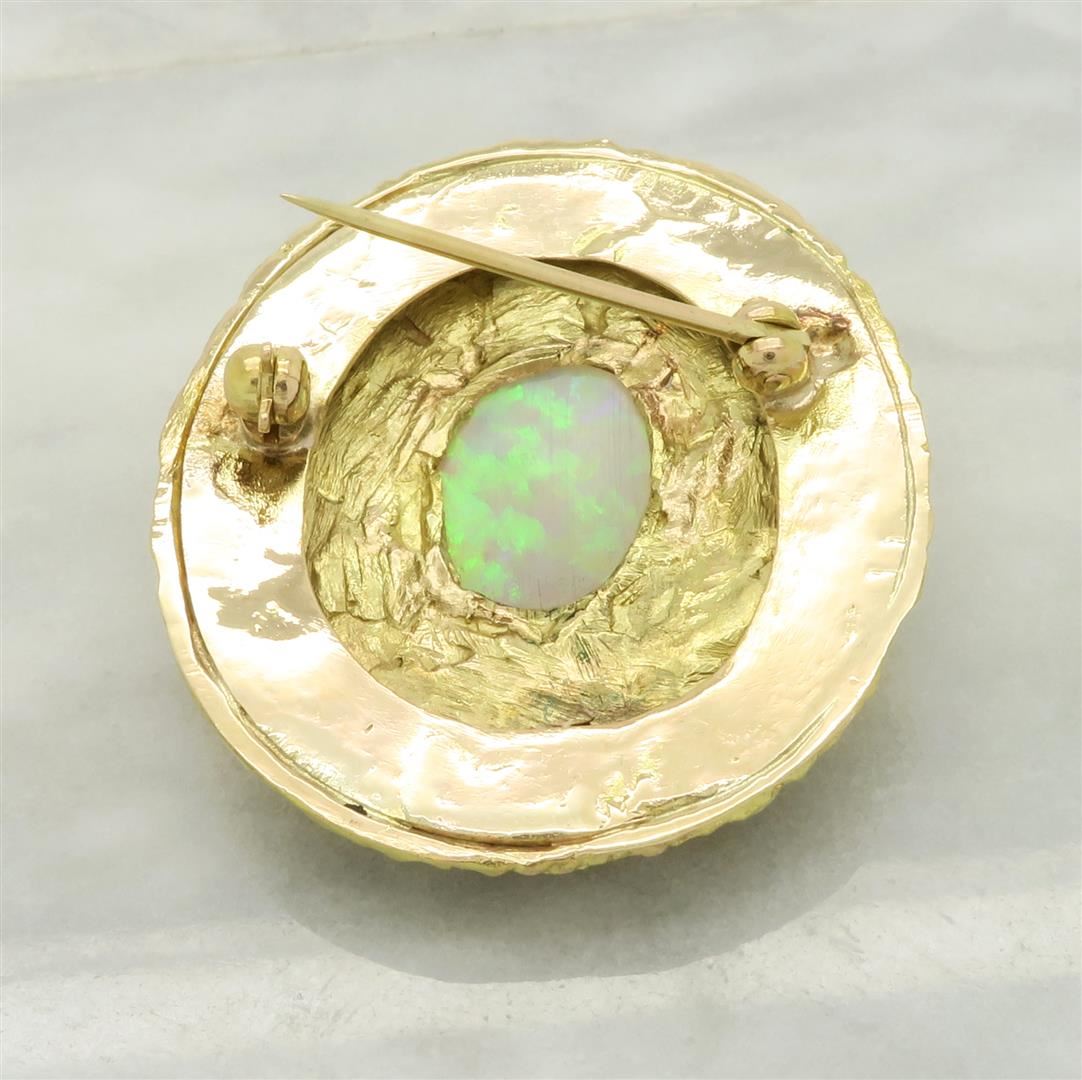 One tested 14K Yellow Gold Opal Brooch. Gemstone Size: 14.00MM X 10.3MM. Weight of Brooch: 14.4grams, Total Brooch Size: 1.4" X 1.5"