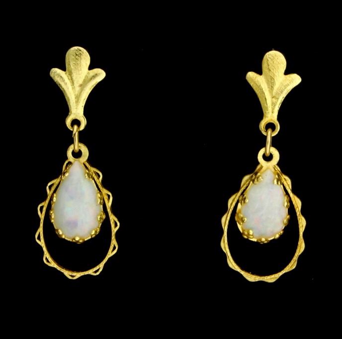 In 14K yellow gold, they are 7/8 inch long and the opals are 8mm pear shape with excellent color of play. 1.0g