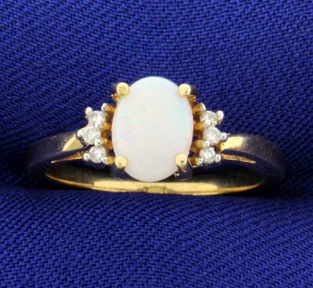 In 14K yellow gold there is a 8x6mm oval opal with great color of play! Also there are six .01ct diamonds. Size 7 1/4 2.9g