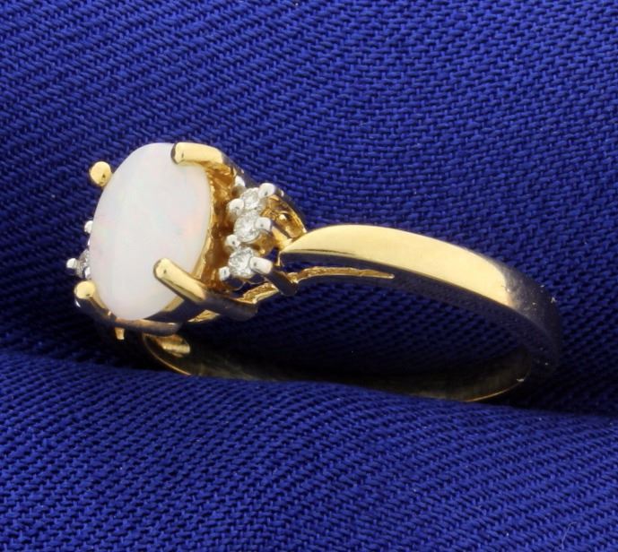 In 14K yellow gold there is a 8x6mm oval opal with great color of play! Also there are six .01ct diamonds. Size 7 1/4 2.9g
