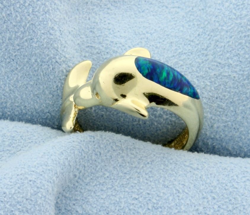 In 14K yellow gold there is a 14x4mm pear shaped opal, with beautiful greens & blues! Size 7 5.2g