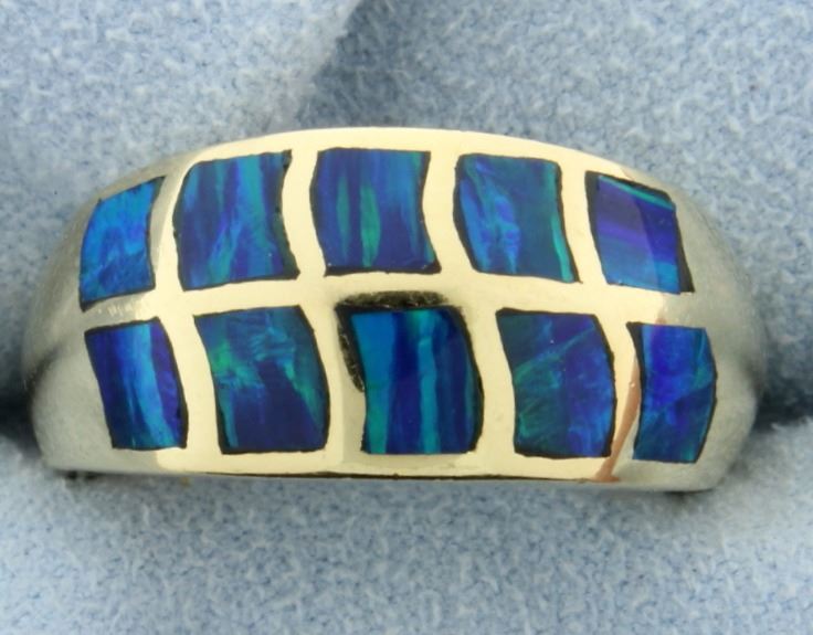 There are inlays of Opal on very beautiful greens and blues! The width across top is 11mm (3/8") and Tapers to 4.25mm. Size 9 1/2. 10.5g