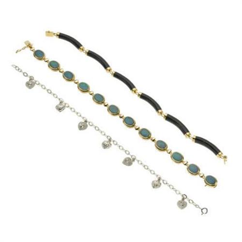 <B>Opal Doublet, Green Stone, Gold Bracelets</B></I><BR><BR>The collection includes: one bracelet featuring oval-shaped opal doublets measuring 8.00 x 6.00 mm alternating with gold discs, set in 14k yellow gold (Length: 7-1/4 inches); one sectional bracelet consisting of green stones, set in 14k yellow gold (Length: 7 inches); together with one bracelet featuring textured dangling hearts, set in 14k white gold (Length: 7-1/2 inches). Gross weight for the collection is 23.00 grams.<BR><BR> <B>Condition Report:</B> Very good condition.<BR><BR><b>Shipping:</b> Miscellaneous Collectibles, Smal (<a target="_blank" href="http://www.heritageauctions.com/common/shipping.php">view shipping information</a>)