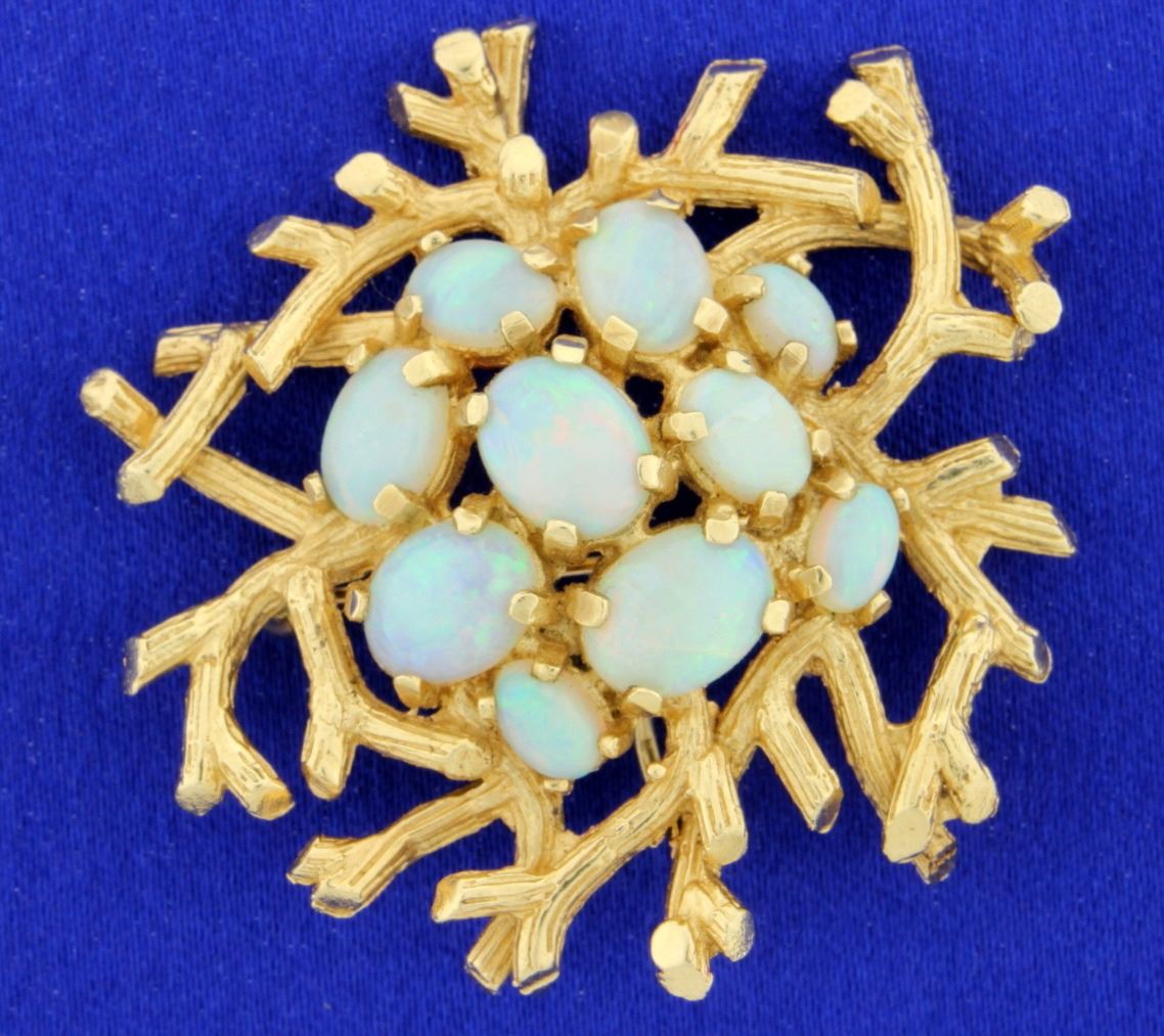 This spectacular 14k yellow gold Opal Pin/Pendant combo is gorgeous! Vintage style, with 10 oval Australian crystal opals that measure from 9mmx7mm to 6mmx4mm. The pendant has a pit of an Asian design to it. The opals are bright with reds, greens, and blues and there are no chips or cracks. The pendant is almost 2" in diameter. 21.2g