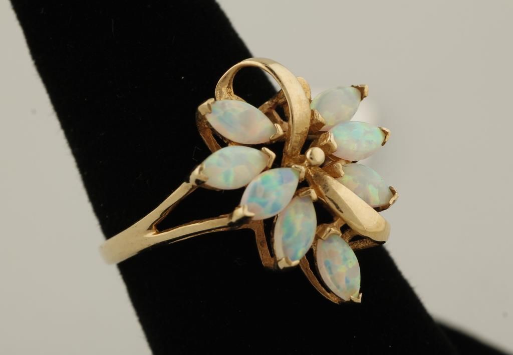 Floral design fire opal ring, with 8 opals set in 10K yellow gold. Size 7.