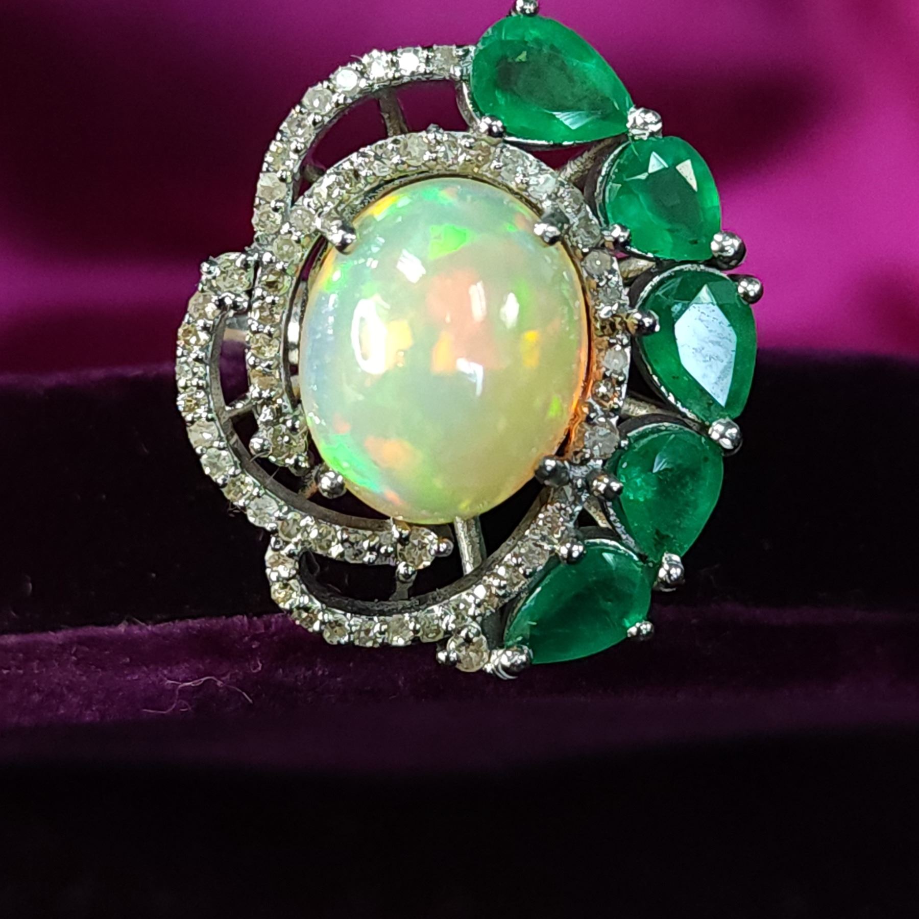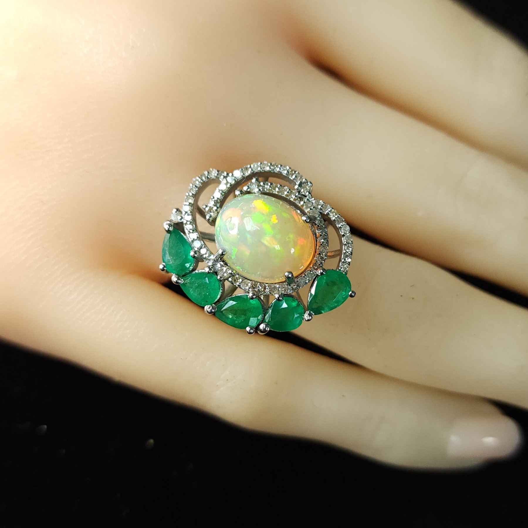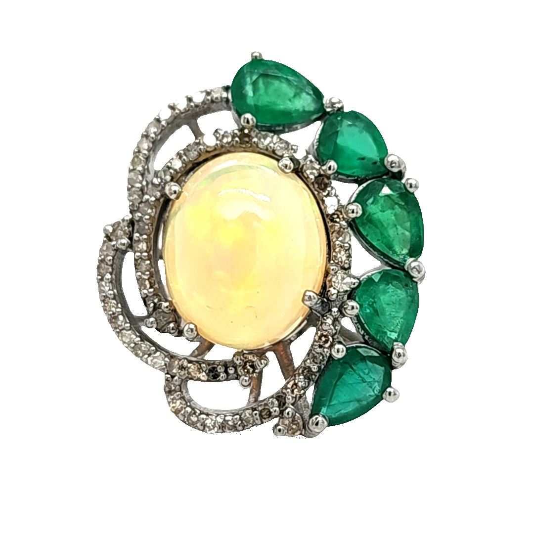 Genuine Opal, Genuine Emerald, and Earth-Mined Diamond Ring.& nbsp; A halo of 1.23 carats natural round, faceted, diamonds sweeps around the 3.40 carat oval, prong-set opal that is aglow with fire, as it is nestled into a 2.10 carat arch of prong-set, genuine pear-cut emeralds in this black rhodium-coated sterling silver ring.& nbsp; The ring is US size& nbsp;7.5 and has an approximate 1.8 mm shank& nbsp; and ribbed side gallery.& nbsp; This is a brand new item in excellent condition.